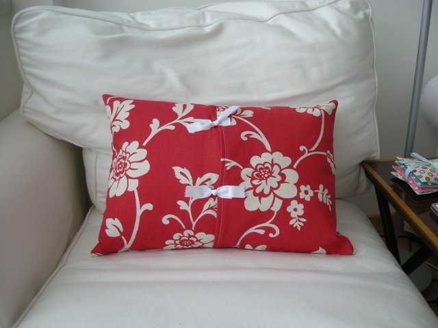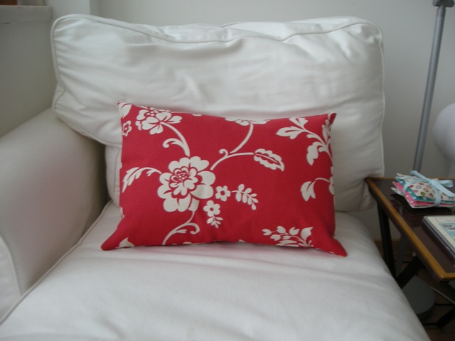These cushions were made in a basic, fast and effective way: one fabric pannel for the front, two pannels for the back and some ribbon (or buttons) to keep everything in its place. A rectangular cushion on the chaise-longue…
