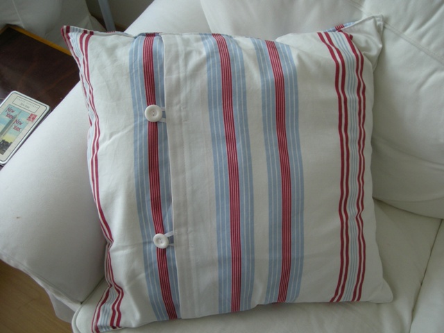 Estas almofadas foram feitas de uma maneira básica, rápida e eficaz: um painel de tecido para a frente, dois paineis sobrepostos para as costas, fita (ou botões) para manter tudo no sítio. Uma rectangular para a chaise-longue