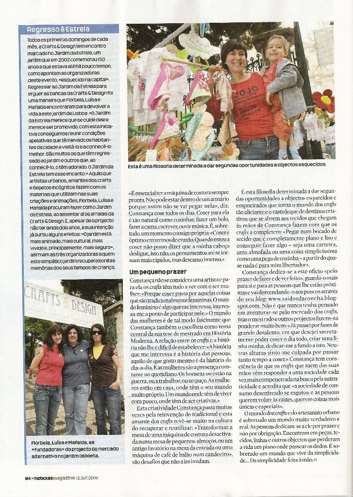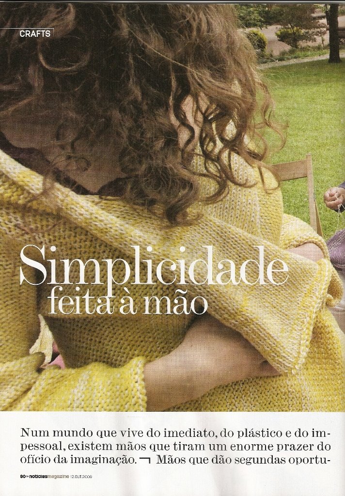 Hoje saiu na Notícias Magazine — a revista de domingo do Diário de Notícias — uma reportagem sobre o movimento handmande. A repórter é a Gracinha e eu apareço nas duas últimas páginas! O facto de não haver fotografia minha é compensado com bastante texto, e eu não poderia estar mais satisfeita. Entretanto já tenho mais um ano do que aquilo que é dito e abri a minha loja… tudo o resto corresponde à realidade!