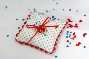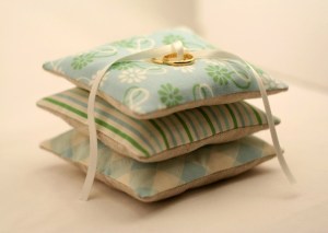 As almofadas são feitas à mão por mim, têm aproximadamente 11 x 11 cm e seguram as alianças através de um botão e de uma fita de cetim. Comecei por fazer oito… vamos ver como corre!