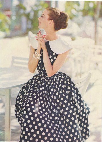 Que chic! Adoro vestidos e tenho pena que já ninguém se vista assim, todos os dias! Quero estes vestidos todos! Um para cada sexta-feira do mês! Que elegância! Comprei um tecido encarnado às bolinhas brancas para alguém me ajudar a fazer uma saia. Mas um vestido…ahhh! A propósito, o vestido que fizeste também é bonito!