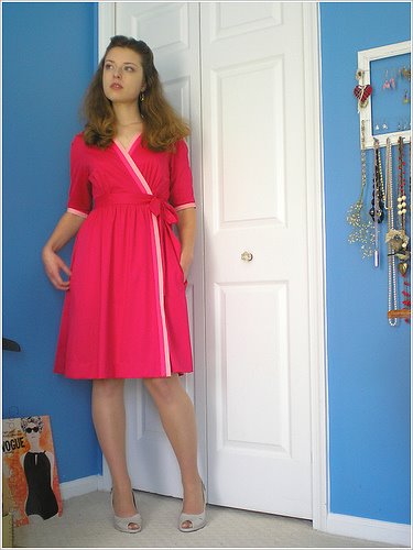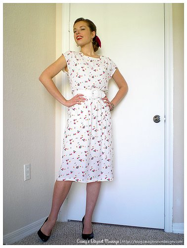 Thrifting + refashioning + home sewing: três actividades que definem o estilo da Casey. Retro-fabulousness também me parece um termo apropriado. A Casey é uma fonte de inspiração inesgotável: tem um jeito especial para descobrir vestidos de décadas passadas, uns em estado impecável, outros nem por isso. Os que são usáveis ela complementa com acessórios vintage e penteados de época; quanto aos outros, sabe cortar e apertar nos sítios certos. E, quando não encontra os ditos vestidos, fá-los a partir de moldes antigos. É preciso dizer mais alguma coisa? Esta menina é a campeã do retro look. Ora vejam: