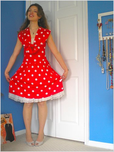 Thrifting + refashioning home sewing: three activities that define Casey‘s style. Retro-fabulousness is also a good word. Casey is an endless source of inspiration: she has a special gift for finding dresses from past decades, some of them in excellent condition, others not quite so. The ones that are wearable she complements with vintage accessories and retro hairdos; as for the other ones, she knows very well where to cut and sew. And when she can’t find the so-called vintage dresses, she makes them using old patterns. Need I say more? This girl is the retro look champion. Take a look: