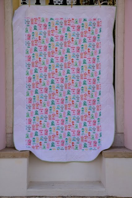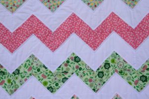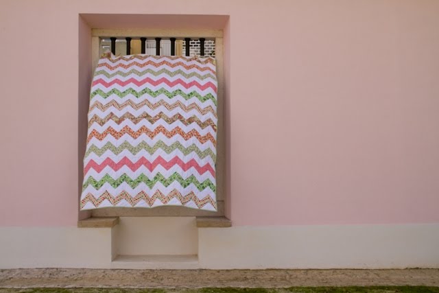 Mais um quilt feito pela minha mãe! Este quilt zig zag, em tons de verde e cor-de-rosa, foi inspirado em fotografias de muitos outros do mesmo género. A minha mãe apontou para uma medida final de cerca de 1,50 x 2m e depois fez as contas para criar este modelo. A maior parte dos tecidos foi comprada na Purl Patchwork, em Nova Iorque. O tecido de trás é Michael Miller e veio daqui.