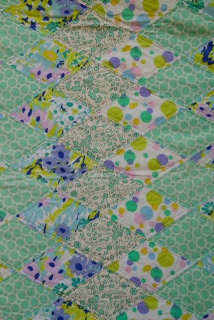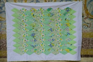 A semana dedicada aos quilts feitos pela minha mãe termina hoje com um quilt de losangos, inspirado num modelo que aparece neste livro do Kaffe Fassett. Os tecidos, muitos deles japoneses, vieram da Purl.