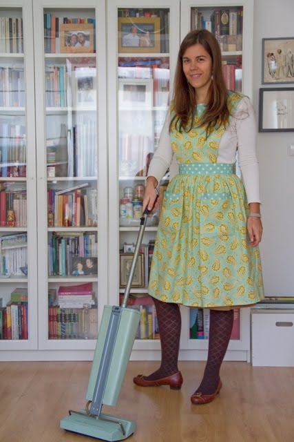Falo muito em vestuário de outras décadas, mas a coragem para fazer roupa a partir de modelos vintage tem faltado. Já alguma vez olharam para um molde anterior a 1970? As ilustrações são ultra apetecíveis, mas quando se chega às instruções… oh là là. Quatro passos apenas, que afinal acabam por levar 16 horas a fazer. Dois dias de trabalho! Para fazer um avental! Há que decifrar as indicações, pois claro, e naquele tempo não havia atalhos. Enfim, mas valeu a pena. Sinto que aprendi alguma coisa, e sobretudo fiquei com um avental único!