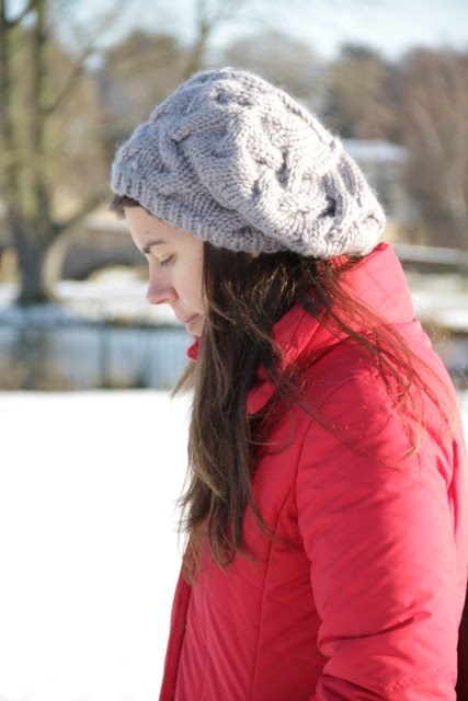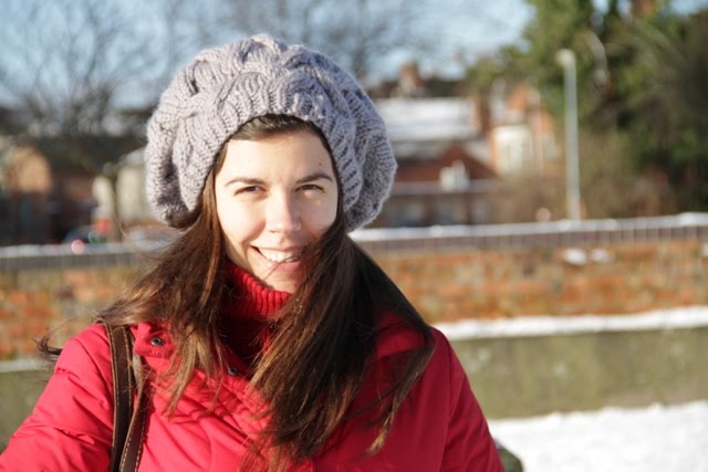 Este Natal recebi imensos presentes tricotados pela minha mãe para sobreviver ao Inverno inglês. Entre eles, esta boina feita com uma lã excelente, a partir destas instruções. Que bom que foi poder usá-la num dia de sol e neve, o meu primeiro dia em Inglaterra! Obrigada, querida mãe!