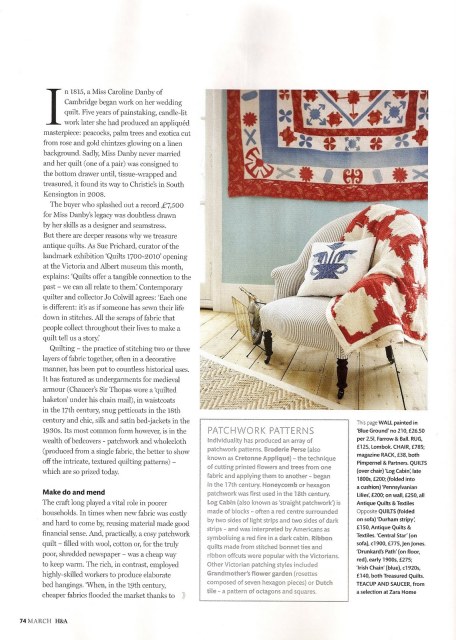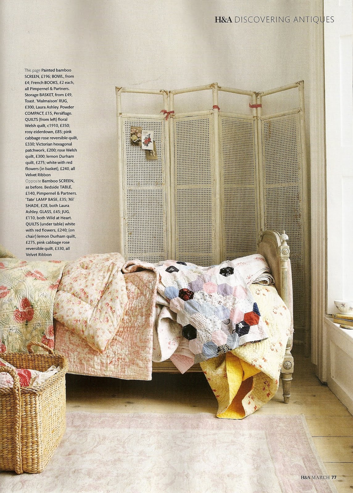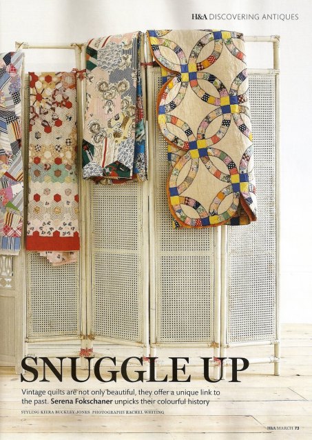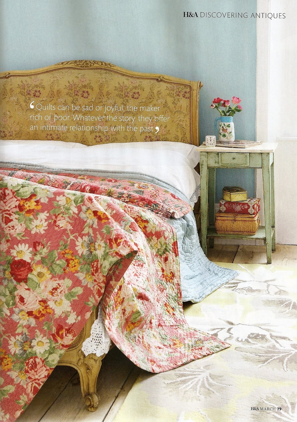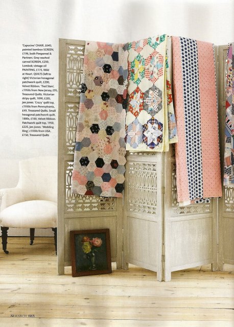 Everyone knows that the BBC is an extraordinary organisation. But, for some reason, I had always imagined Homes & Antiques to be a rather dull magazine… well, I was completely wrong! What caught my eye at first was the amazing photo styling, and then I saw the homes they feature, as well as the clever mix of antique and modern pieces… I think I’m going to subscribe to it! The theme for the March issue is quilts and of course I immediately thought of showing you some of its inspiring pages.