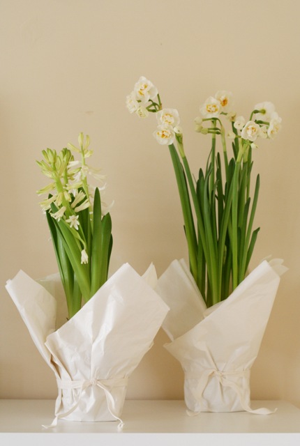 Bolbos são omnipresentes nesta terra. Depois de os ver à venda em todas as esquinas, fiquei com vontade de ter alguns na nossa sala. Um dia o Tiago chegou a casa com estes dois exemplares (sim, ele é mesmo o melhor marido do mundo!). Cheiram lindamente e é uma maneira óptima de ter flores frescas todos os dias. Enquanto não arranjo umas taças destas, cobri os vasos (de plástico, bah!) com papel de seda branco.