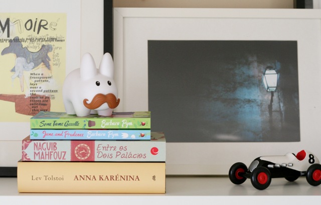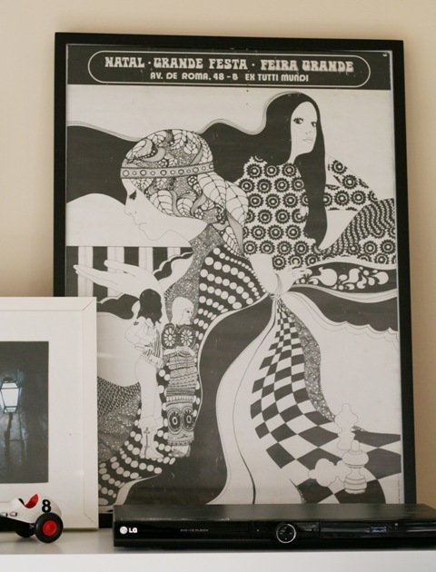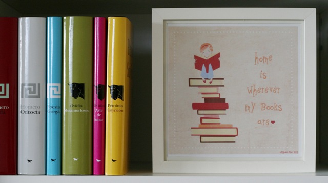 This is my pile of books awaiting to be read (I find that if I place them on the shelves, I quickly forget them). The print is by Pedro Gaspar, the photo was taken by Tiago, the rabbit is called Labbit and the car is from FAO Schwartz.
