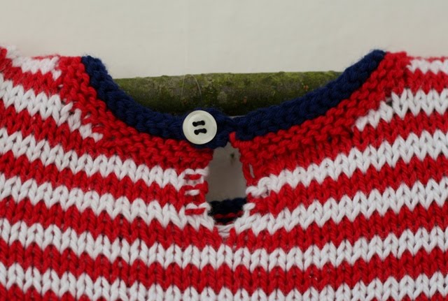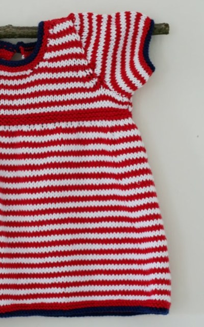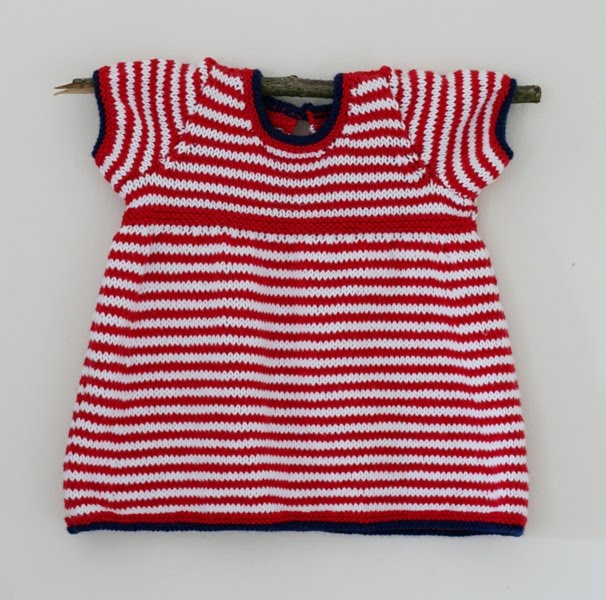 I must share with you the dress my mother knitted for the daughter of a friend of mine. The pattern was included in the Spring/Summer 2009 issue of Debbie Bliss magazine and my mum used cotton yarns in nautical colours. I love stripes for Summer!