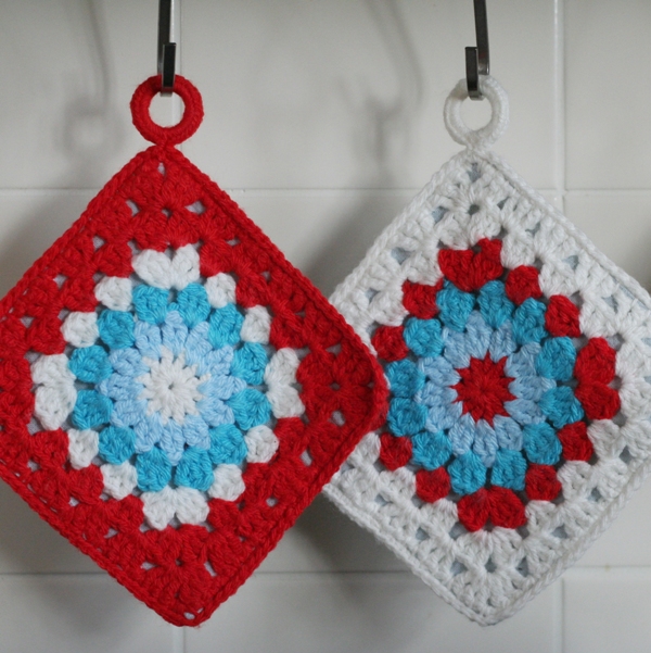 Some months ago I received these potholders made by Cristina. As you can well imagine, they couldn’t look any better in my kitchen. I confess I haven’t got the heart to actually use them… they are in display!