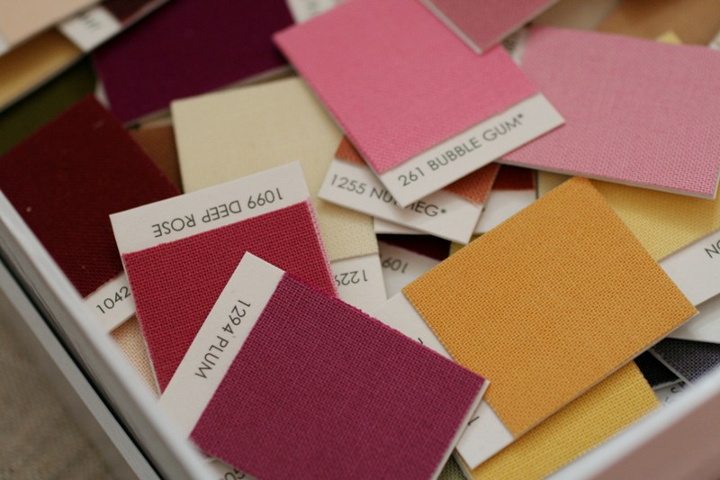 Gosto imenso de quilts em cores lisas e há um ano fiz um para os meus amigos holandeses. Usei o mostruário como referência mas, apesar de muito útil, fez-me falta poder pôr as amostras umas ao lado das outras. Agora que quero fazer um quilt cá para casa em tons de azul, verde e cinzento, resolvi cortar o mostruário em quadrados individuais. Acho que não devemos ser escravos dos objectos e, se algo não funciona, há que não ter medo de mudar!