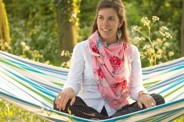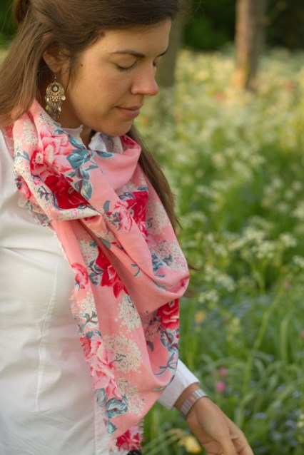 Hopelessly romantic, this scarf features large Chinese peonies on a lovely pink background and it’s perfect for both work  weekends. Made in a very soft, leightweight cotton voile, this scarf is square and fringed. It’s available right here.