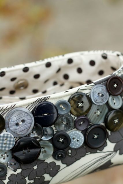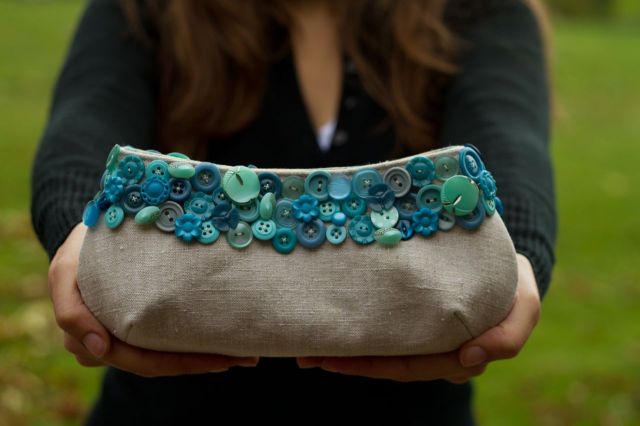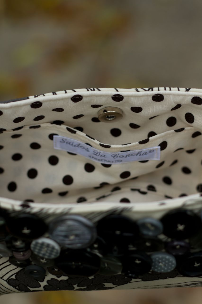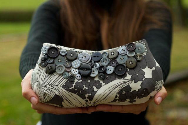 Após muitas, muitas horas a escolher a cor, o tamanho e a localização ideal de cada botão, posso finalmente dizer que há três novas clutches disponíveis na loja. Duas são feitas em linho grosso e cada uma tem mais de 100 botões cosidos a toda a volta (uma em tons de azul, a outra de castanho); a última é feita num algodão estampado com flores gráficas e tem 40 botões em tons de cinzento e preto cosidos apenas no centro. Estão as três aqui.