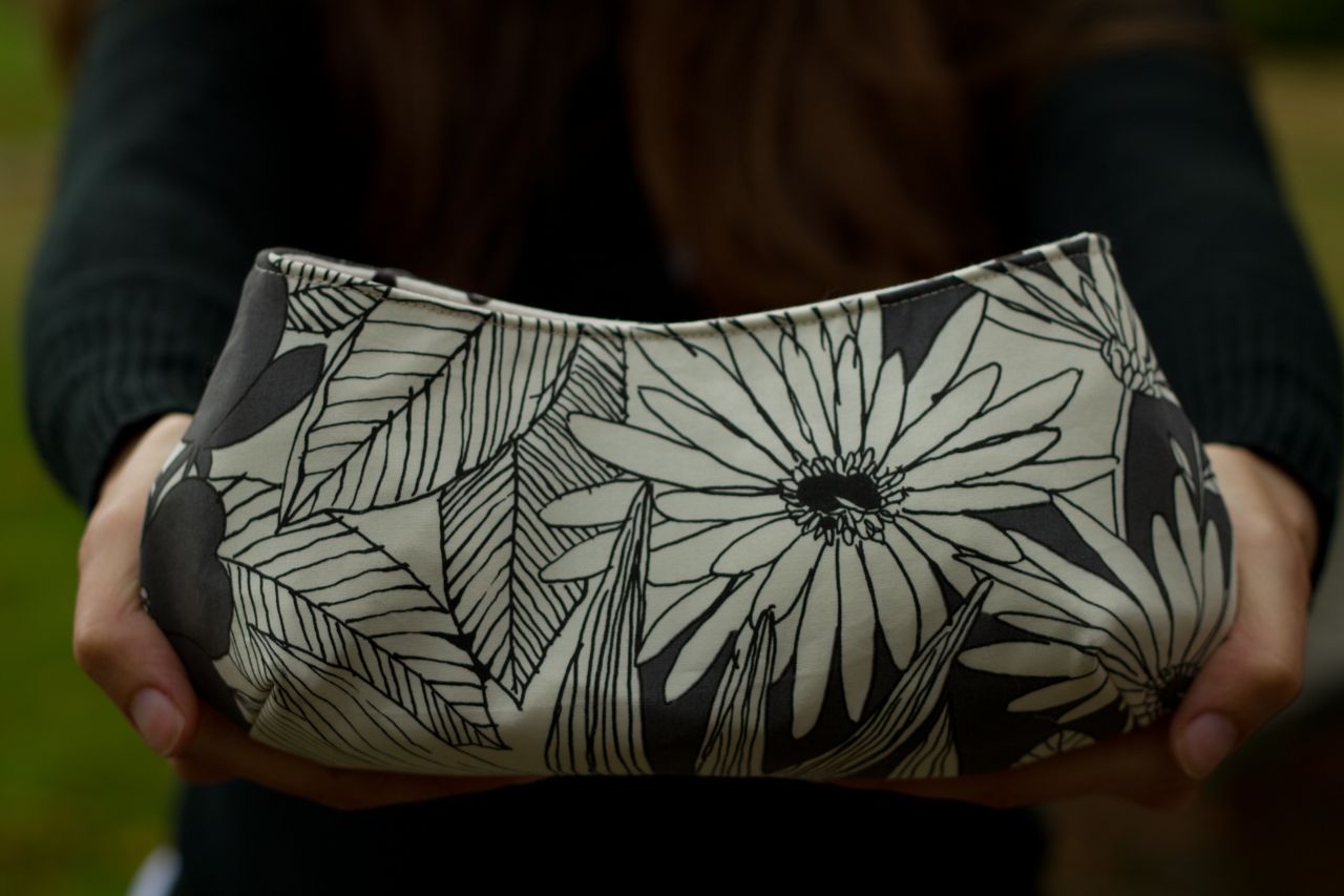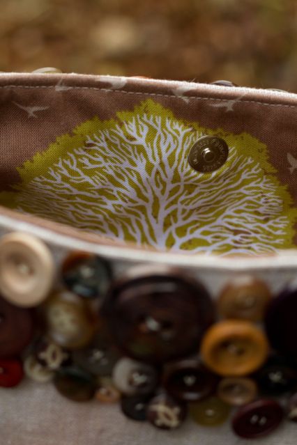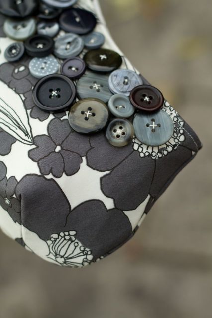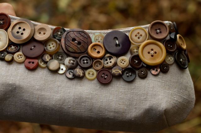 After many, many hours choosing the ideal colour, size and placement for each button, I can finally say that there are three new clutches in the shop. Two of them have been made in corse, unbleached linen and each of them has more than 100 buttons hand-sewn all around its top (one in shades of blue, the other in tones of brown); the third one has been made using a piece of cotton printed with graphic flowers and has 40 buttons in black and grey hand-sewn to its centre pannel. They’re all available here.