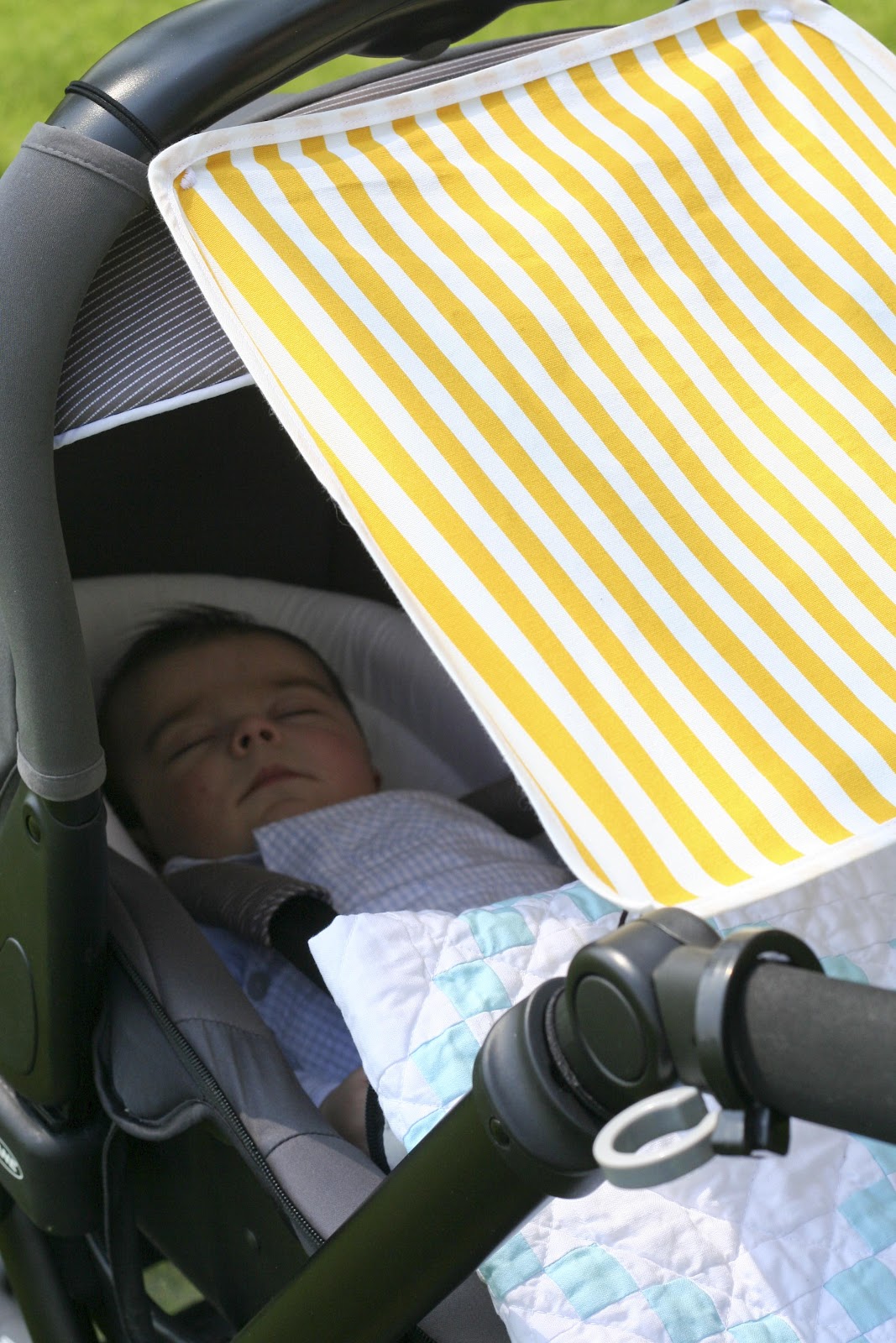 Com a chegada do sol, tornou-se imperativo arranjar uma maneira de fazer sombra para o carrinho do Rodrigo. Claro que havia sempre a opção de comprar um guarda-sol, mas preferi algo mais personalizado (e mais barato). Inspirada nas barracas de praia, escolhi uma lona às riscas amarelas e brancas para fazer um toldo à medida. É alegre e funciona!