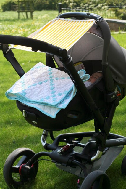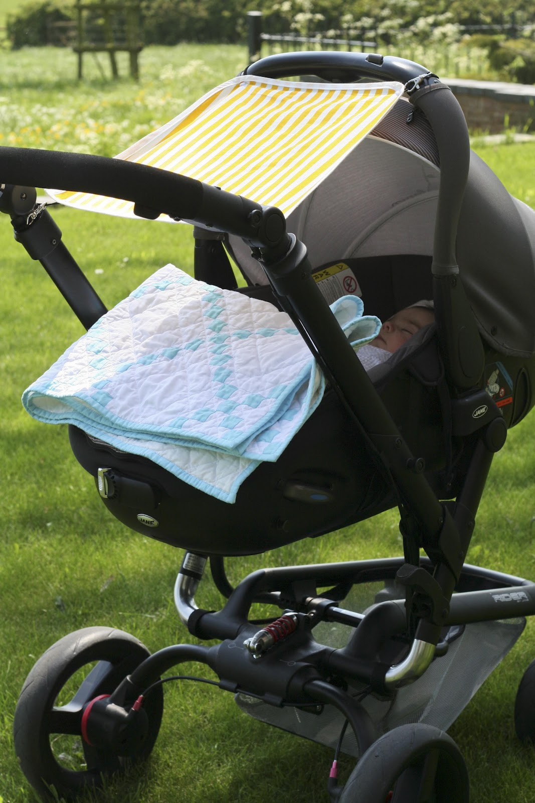 Now that the sun is finally here I had to come up with a way to provide some kind of shade for Rodrigo’s pram. Buying a parasol would have been the simplest option but I much rather have something more personalised (and cheaper). Inspired by beach huts I chose a stripey canvas in yellow and white to make a bespoke canopy. It’s very cheerful and it works!