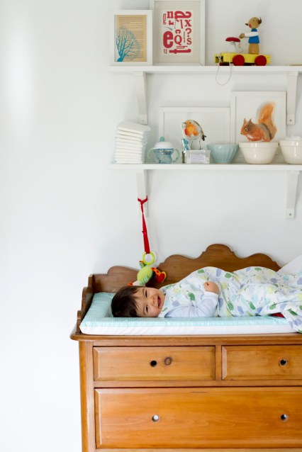 Saturday morning. A chest of drawers bought at an antiques fair in need of new knobs (the ones that came with it were rather pretentious). A pair of Ikea shelves. Some art bought on Etsy over the years. An old wooden toy found in a charity shop. A pile of disposable nappies (I like the idea of cloth nappies but I haven’t got the guts for it). Some bowls with cotton wool and water instead of wipes. A musical toy. The cheapest (and most attractive) changing mat I could find. A room filled with morning light. One happy baby!