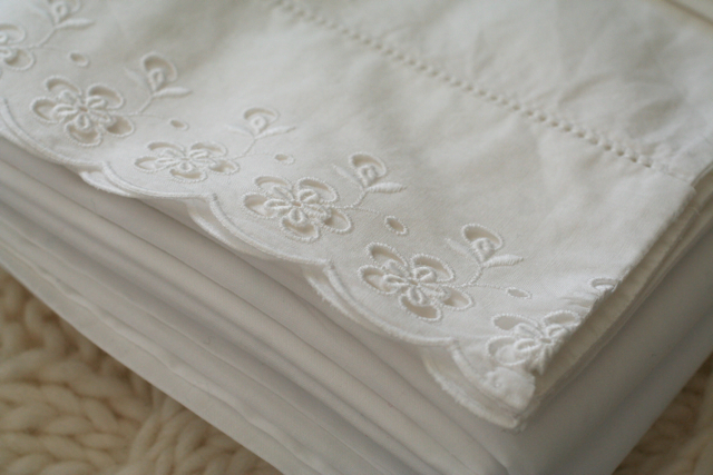 Ever since I was a little girl I’ve had a real fascination with house linen. If it’s part of someone’s trousseau, that’s even better. I love looking at bed sheets, pillow cases, tablecloths, linen hand towels, placemats — I like unfolding them, touching them and asking questions: who has embroidered it? who has commissioned it? who has used it? what’s it for? My mother was lucky enough to still have her bed linen embroidered by nuns (did that still exist in the 1960s? I want that too!). I confess I don’t much care for lace but give me hand-drawn hems, broderie anglaise and satin stitch and you’ll make me a very happy woman indeed.