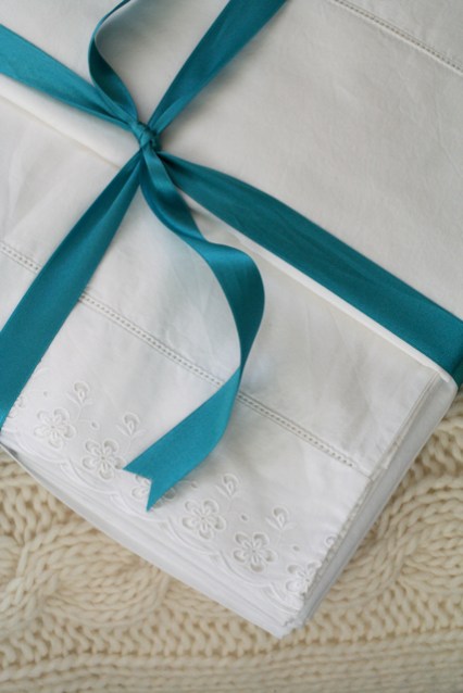 When the time came to choose a wedding present for my dear friend Mafalda, I thought I’d give her bed linen. She doesn’t like quilts and my mother had already given her an embroidered tablecloth so my options were quite limited. I bought one plain sheet and two pillowcases (the best quality ones I could find in Lisbon) and stitched an eyelet panel over the edges. I think the set turn out both beautiful and practical for daily living (truth is, frills and ribbons and elaborated embroideries are a pain to wash and iron). Of course there’s much more refined bed linen available out there (you simply have to pop into Paris em Lisboa) and naturally nothing beats an antique bed sheet that used to belong to your great-grandmother, but I was pleased with this gift. I sincerely hope she likes it (and her husband as well)!