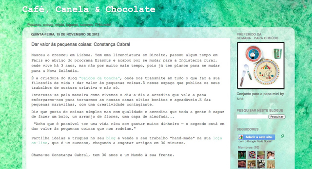 Me @ Café, Canela & Chocolate November 17, 2012December 8, 2015 Um pequeno texto sobre mim no Café, Canela e Chocolate. Muito obrigada, Sofia! I’ve been featured on Café, Canela & Chocolate (in Portuguese only, sorry). Thank you, Sofia! Share this: Click to share on Pinterest (Opens in new window) Pinterest Click to share on Facebook (Opens in new window) Facebook Click to share on X (Opens in new window) X More Click to share on Pocket (Opens in new window) Pocket Click to email a link to a friend (Opens in new window) Email Click to print (Opens in new window) Print Click to share on Tumblr (Opens in new window) Tumblr Like Loading... Related