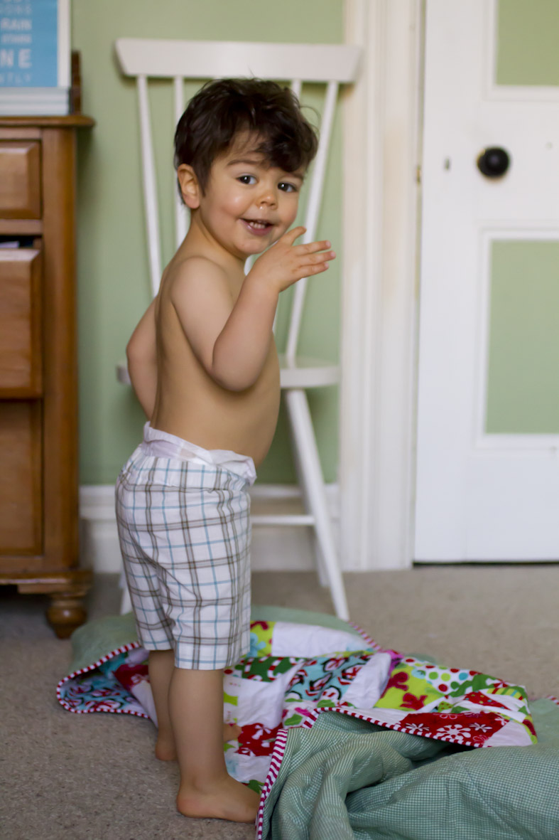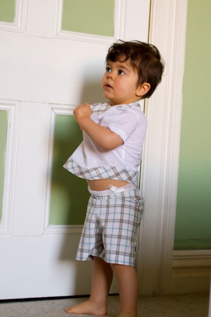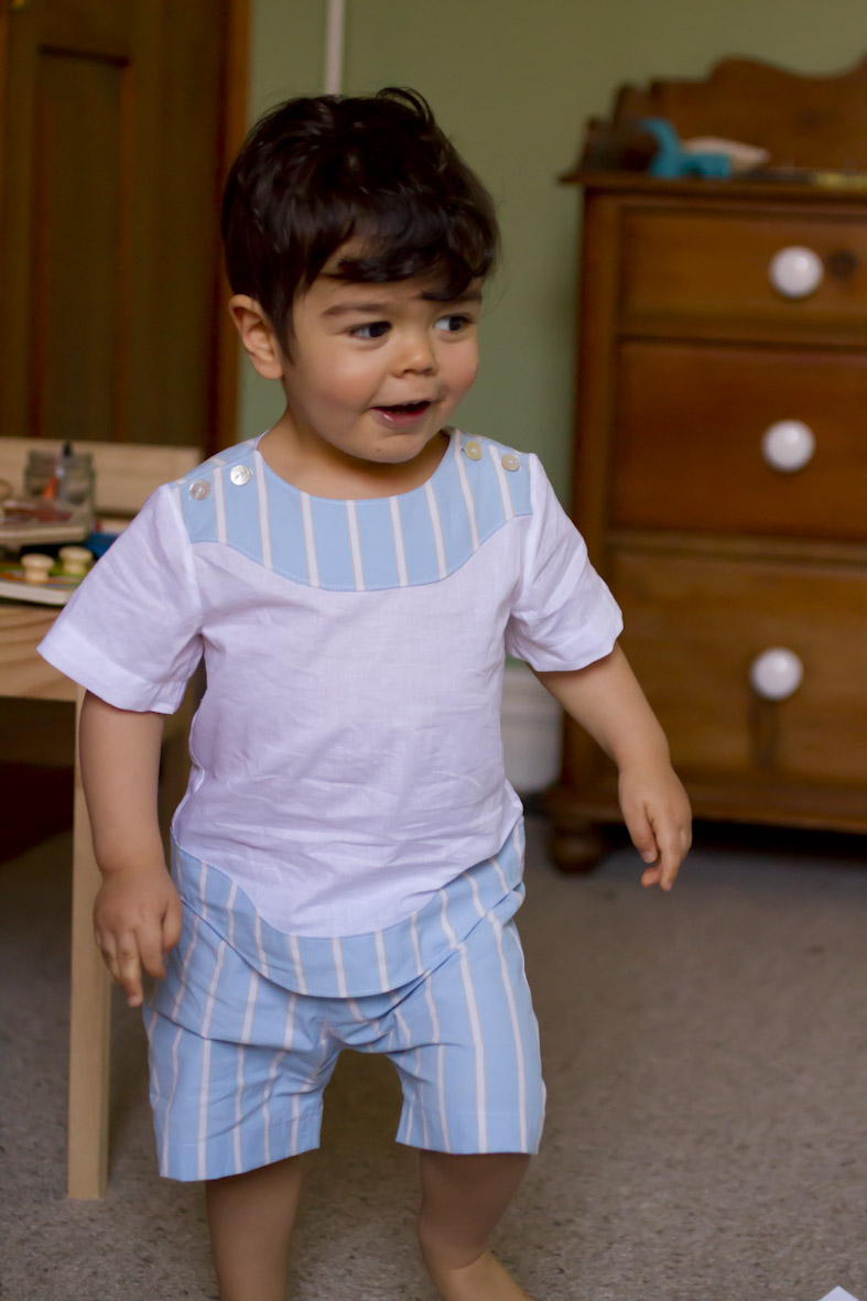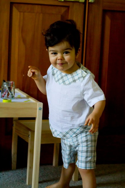 Given Rodrigo’s measurements I started by making the first pjs in a size 2 (he’s 18 months old). When I tried them on, both the shorts and the top were a little too snug. I mean, they’d work for now but they wouldn’t fit him when summer arrived in NZ. So I decided to make the other two pjs in a size 3. In the meantime, the little boy got ill and lost some weight (goodness, this sounds overly dramatic), which means that the first pjs are now a perfect fit.