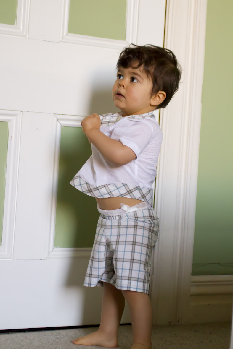 The shorts were made using the KID Shorts Made pattern. The top is the Sailboat Top from Oliver+S with some alterations: I shortened the sleeves and cut the facings in a contrasting fabric and stitched them on the outside of the garment (they’re supposed to be made in a matching fabric and sewn on the inside). Why didn’t I just sew the shorts and bought some white t-shirts? Because I abhor hot clothes and I believe batiste is much cooler than t-shirt jersey.