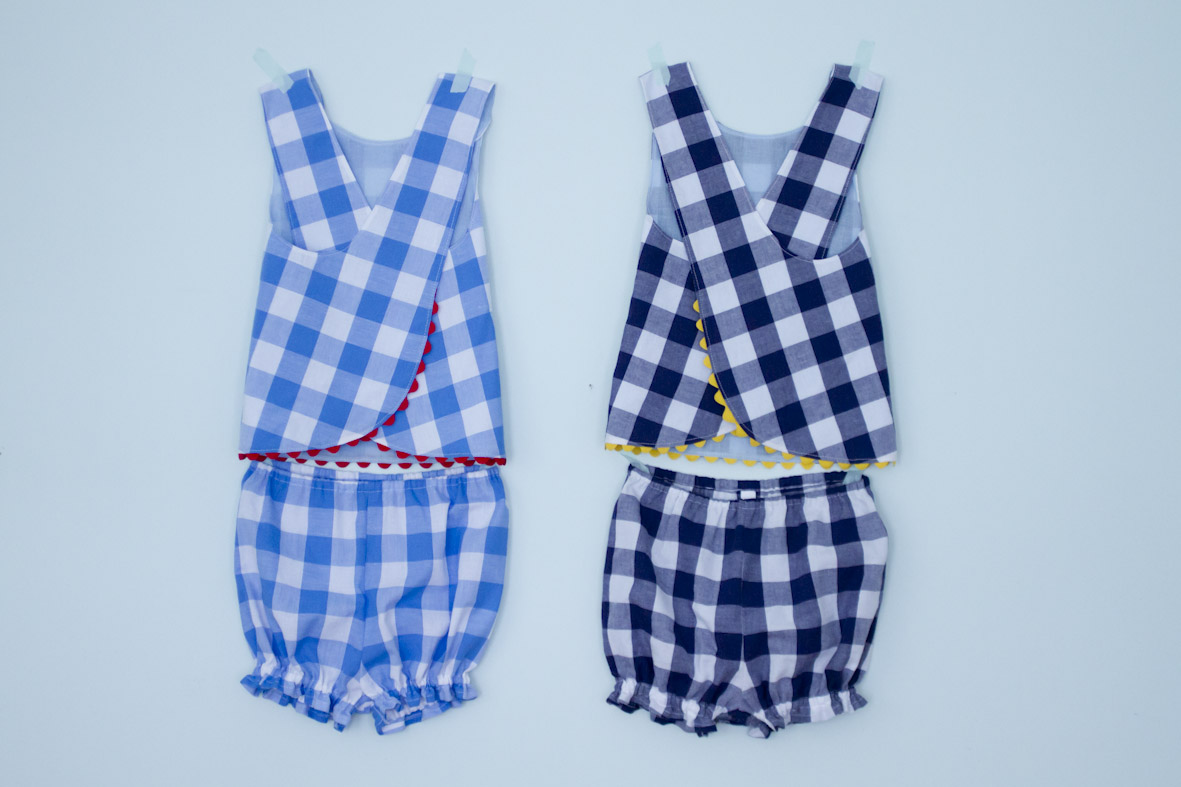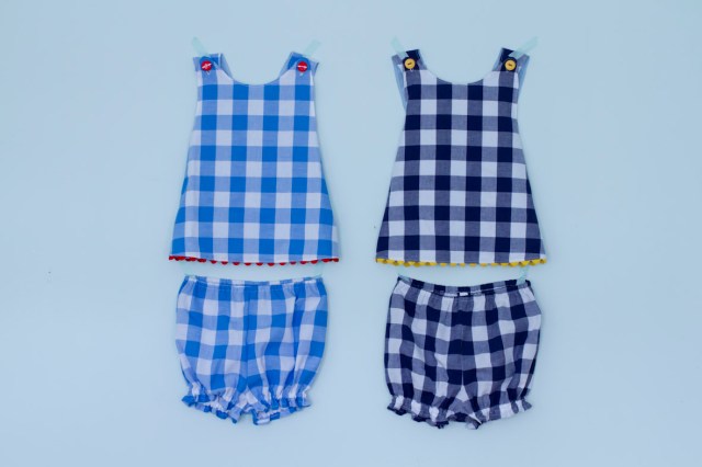 Mariana is the mother of two 2-year-old twin girls. I thought it would be fun to sew something for them and decided to try one of my vintage children’s patterns, this Simplicity 8165 from the 1960s (first photo). I chose two lightweight gingham fabrics for the tops and bloomers and pale blue cotton batiste for the lining. Even though they turned out rather cute, the moment I finished them I wished I could start all over again. Why? Well, for starters, they’re less than perfect: the squares are poorly matched and I pinked all the seams (they were made before my pledge). And I guess I should have chosen white rickrack and white buttons for both outfits. Oh well, you can’t always get things right first time round. Next time I’ll know!