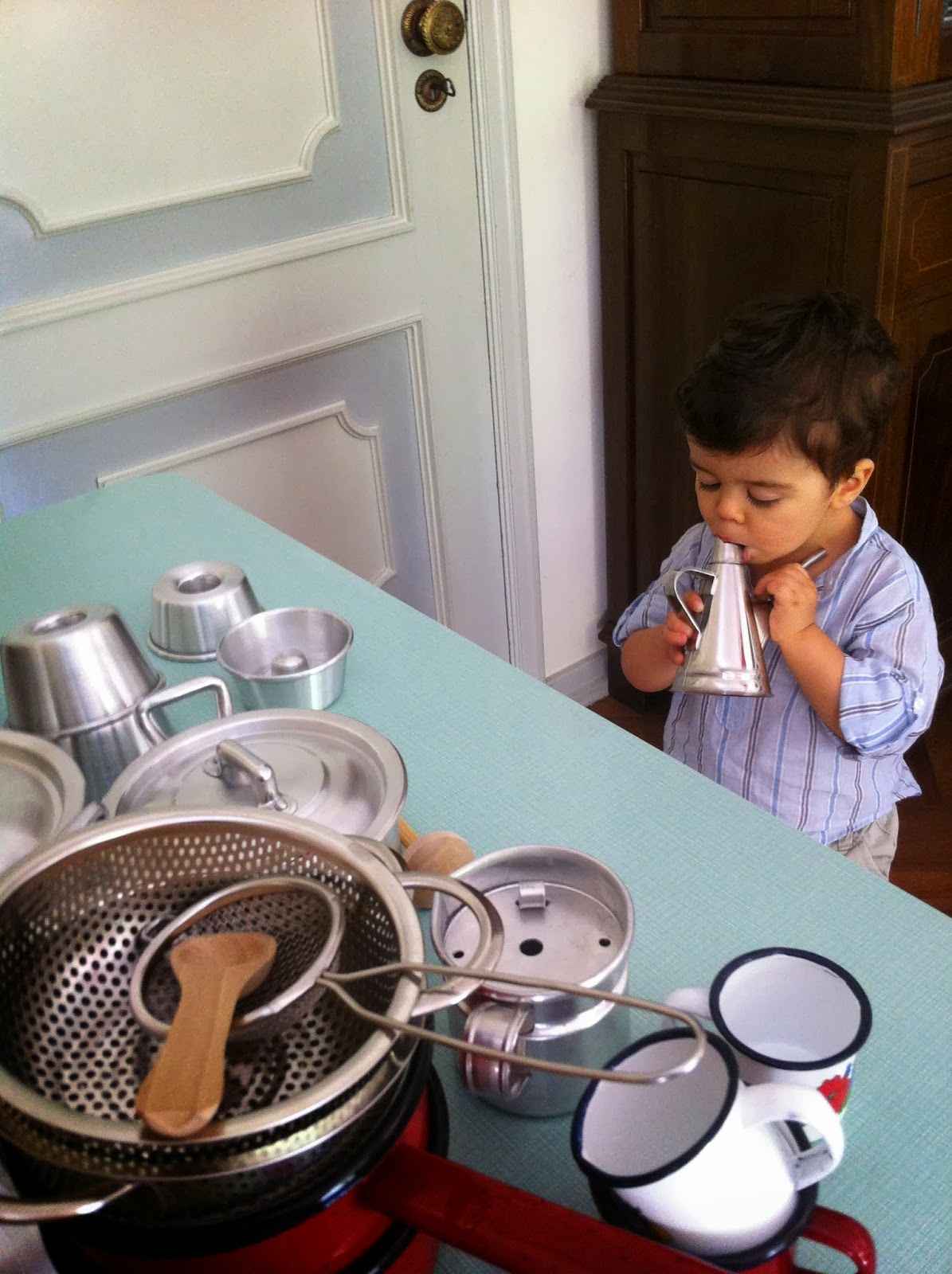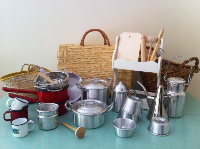 Now that I’m in Portugal I’ve been searching through every market, old grocery stall and kitchen shop for little kitchen objects. The simpler, the better. Enamel pots, aluminum pans, a traditional olive oil container just like the one we’ve got in our kitchen, an old fashioned milk boiler, a coffee maker, a couple of strainers… only the wooden board and dough roller are meant to be toys — everything else is “for real”.