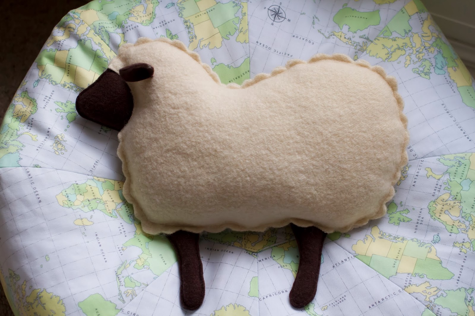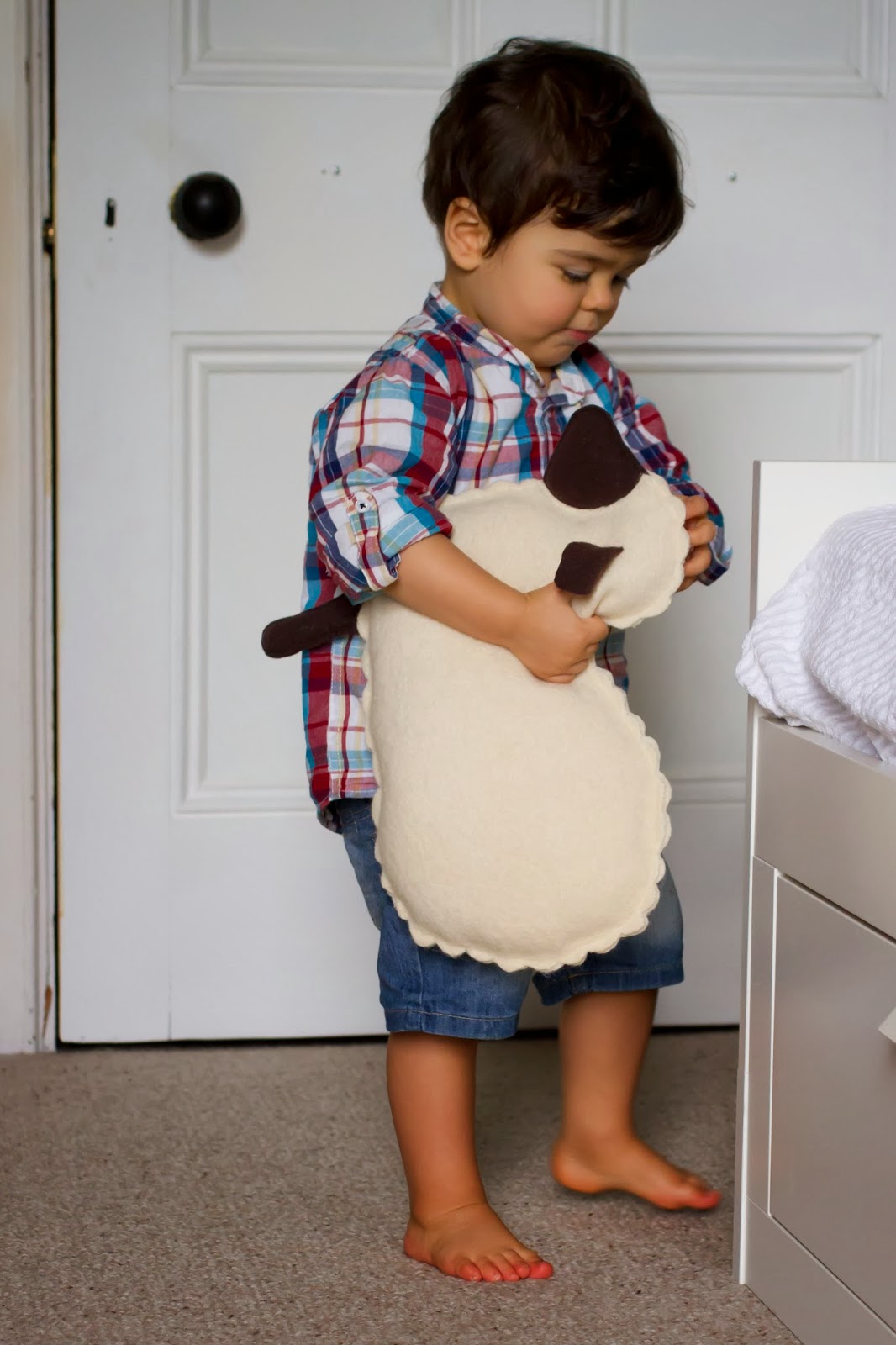 Para além de cães, o Rodrigo anda obcecado por ovelhas (baa em rodriguês: as ovelhas cá fazem baa em vez de méé). Lembrei-me então de fazer-lhe uma Little Lamb Pillow (instruções aqui). Para o corpo usei um cobertor antigo que feltrei na máquina e para as patas, orelhas e focinho uma camisola castanha que era da minha avó, que também feltrei.