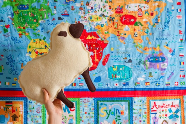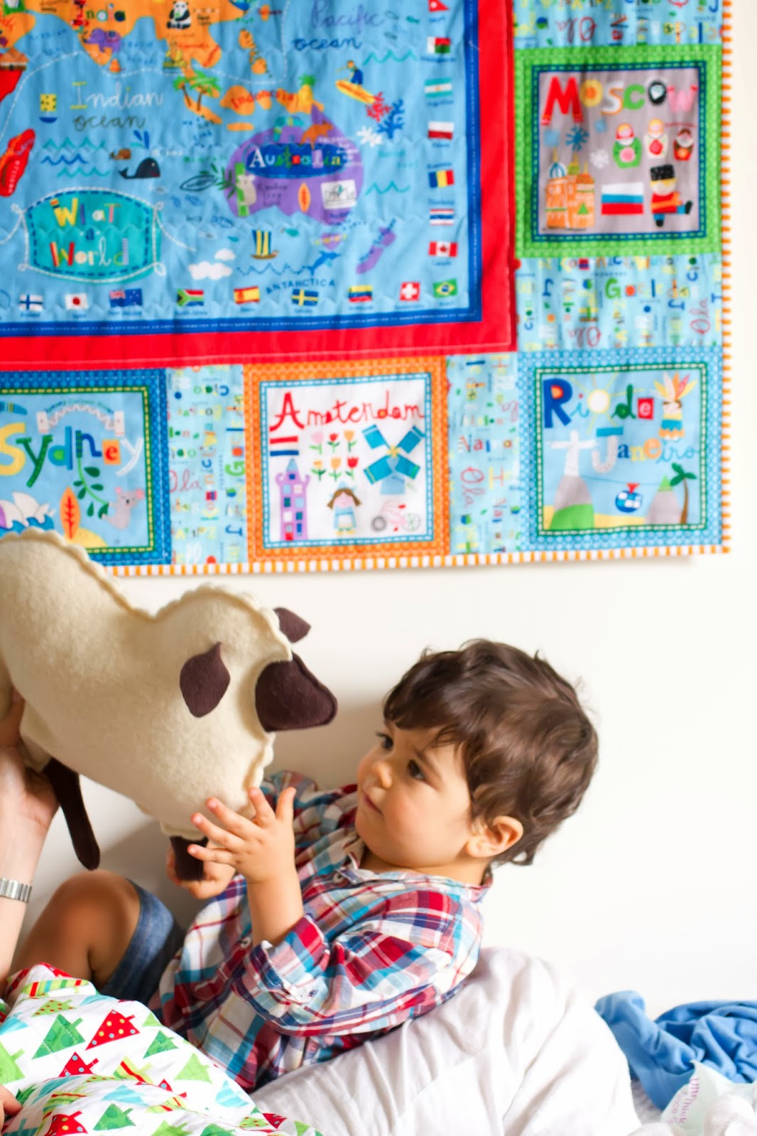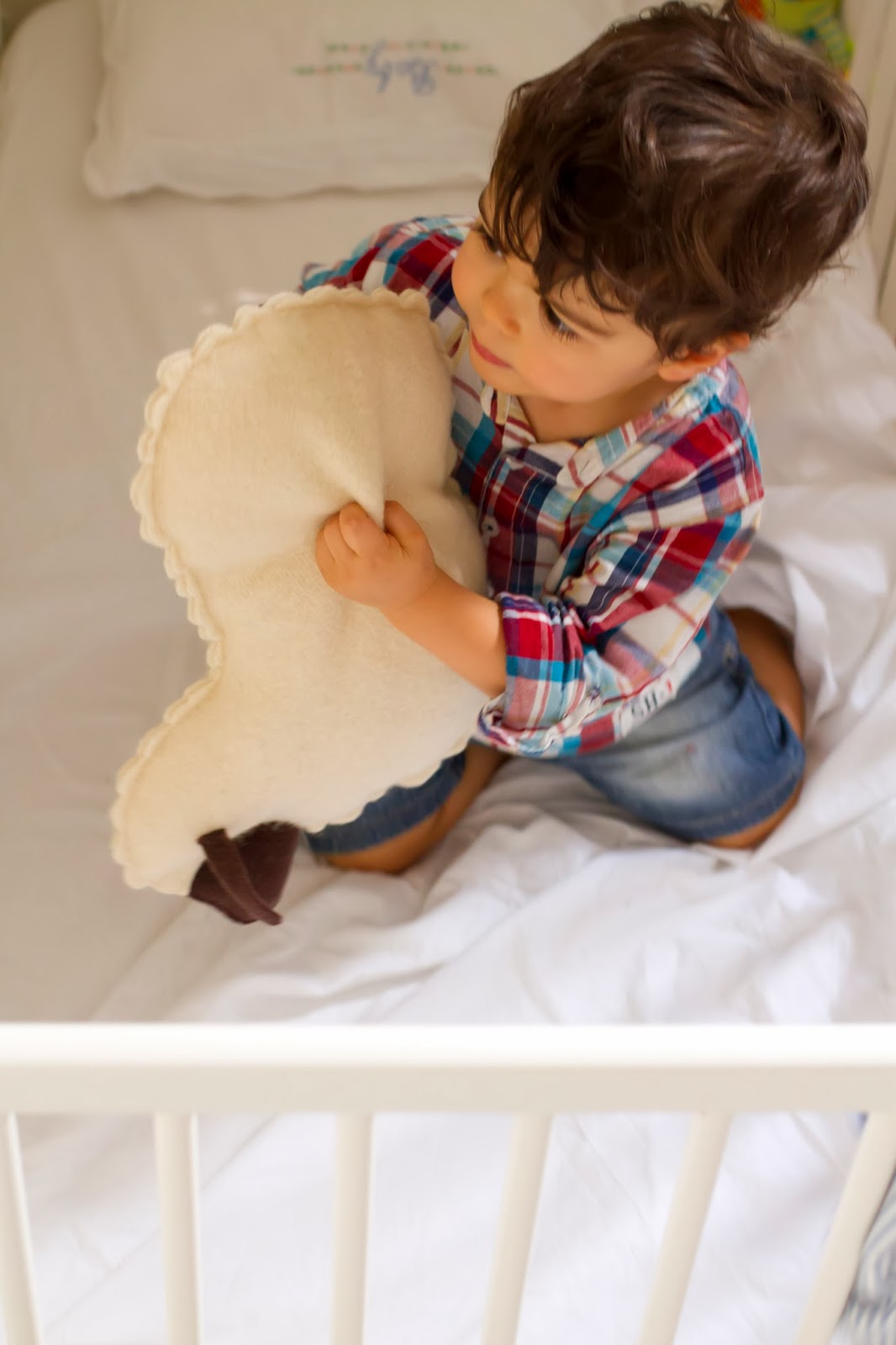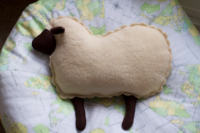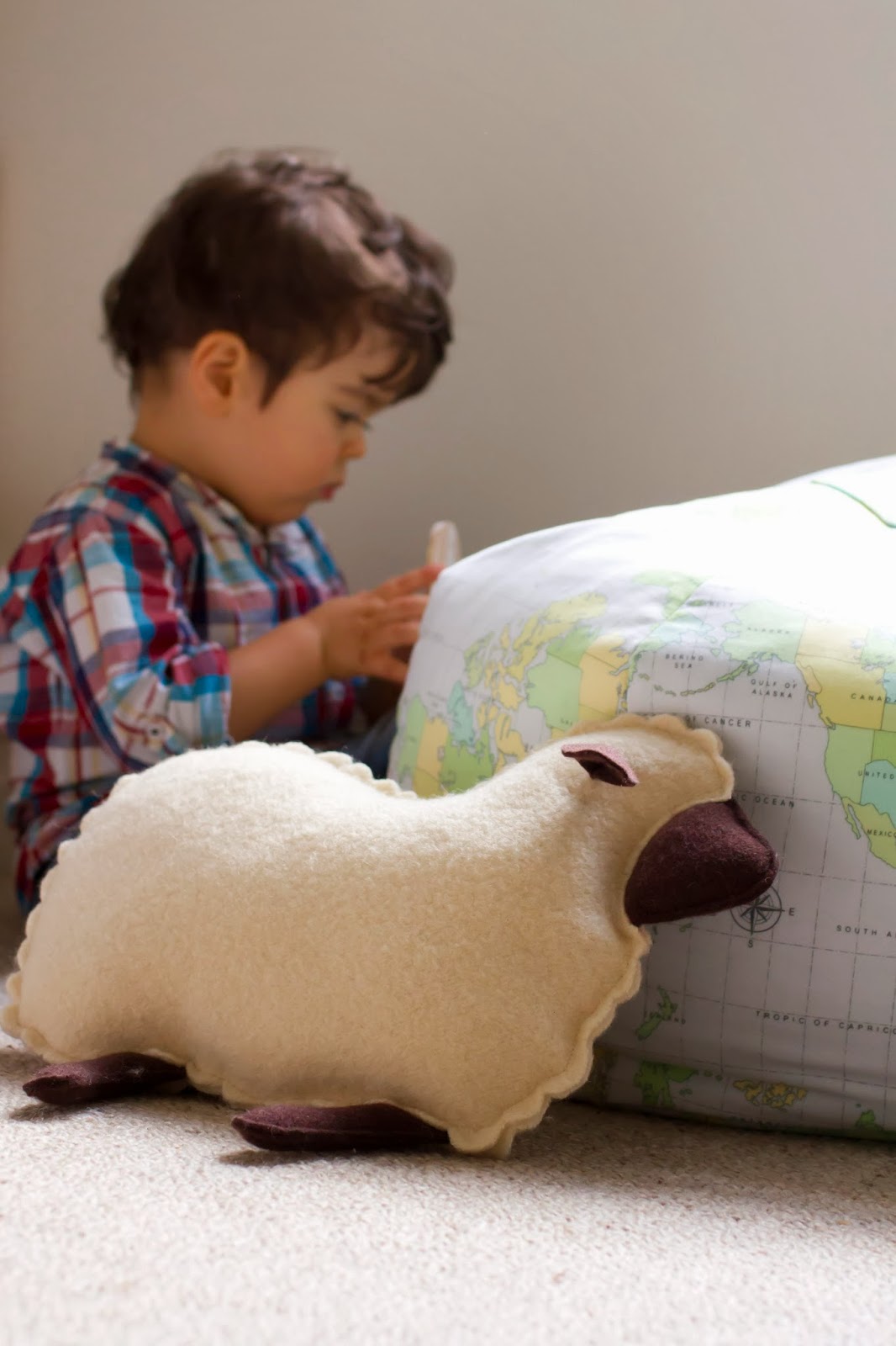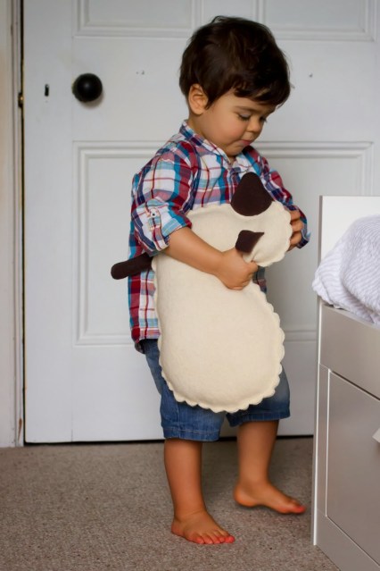 In addition to dogs, Rodrigo is currently obsessed with sheep (he calls them baa). So I figured I had to make him a Little Lamb Pillow (instructions here). For the sheep’s body I used an old blanket that I felted in the washing machine and for the legs, face and ears I used an old brown sweater that used to belong to my grandmother, which I also felted.