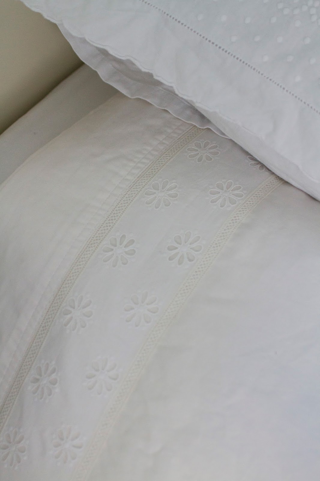 What gorgeous bed linnen! I must try the sheet thing too, with the added eyelet. That's what really makes it special I think. 🙂