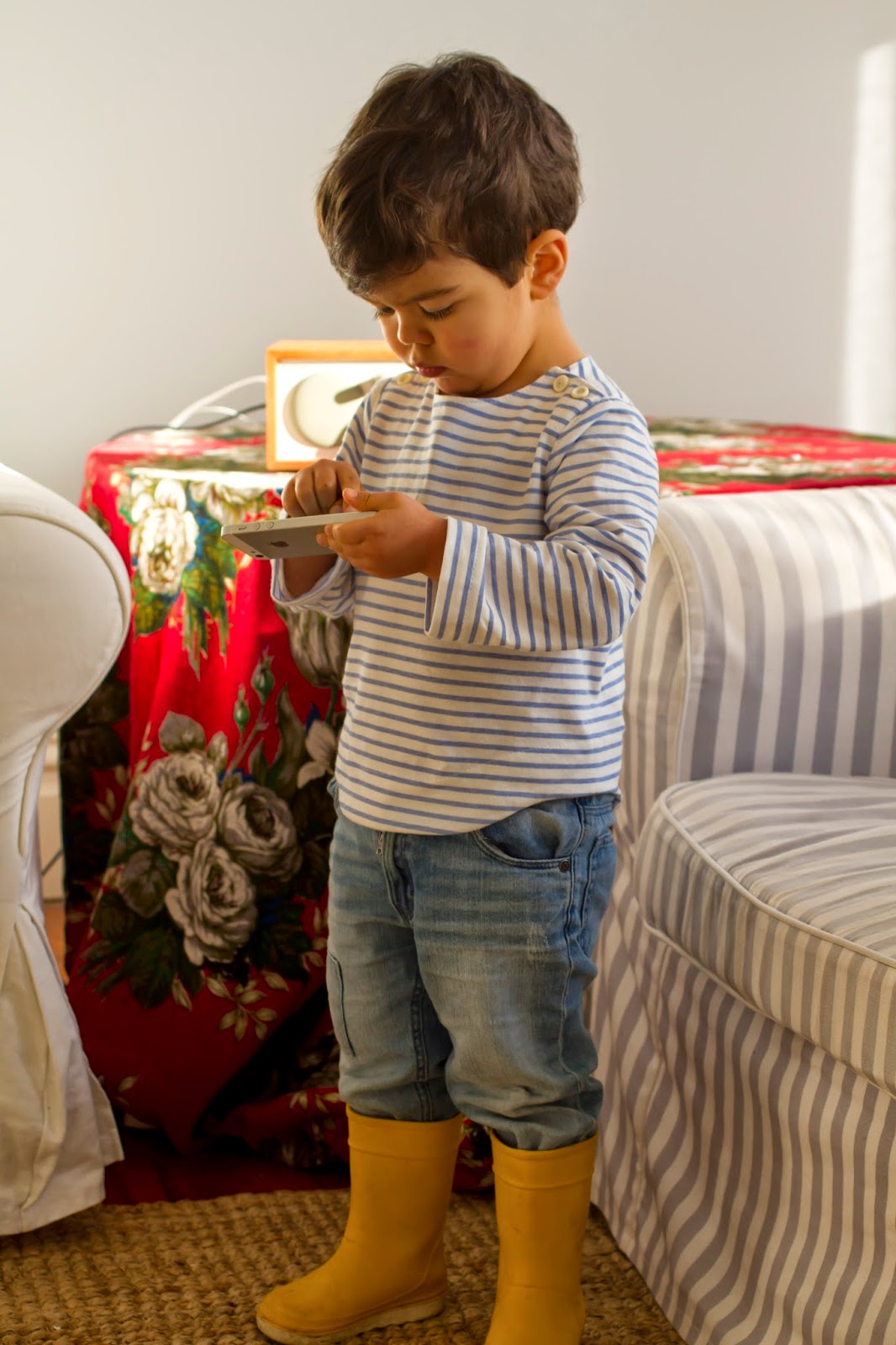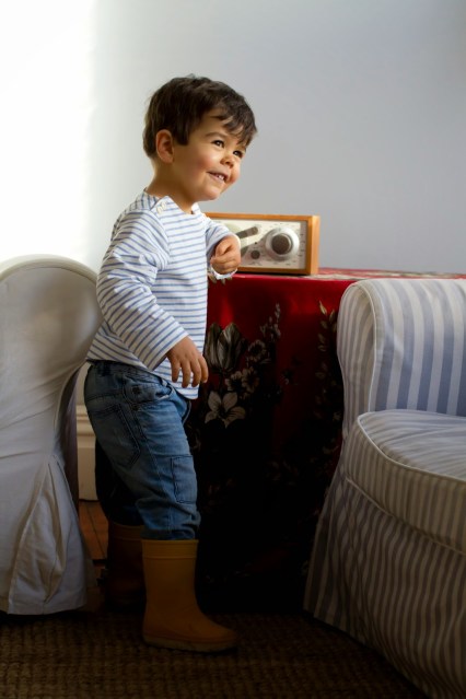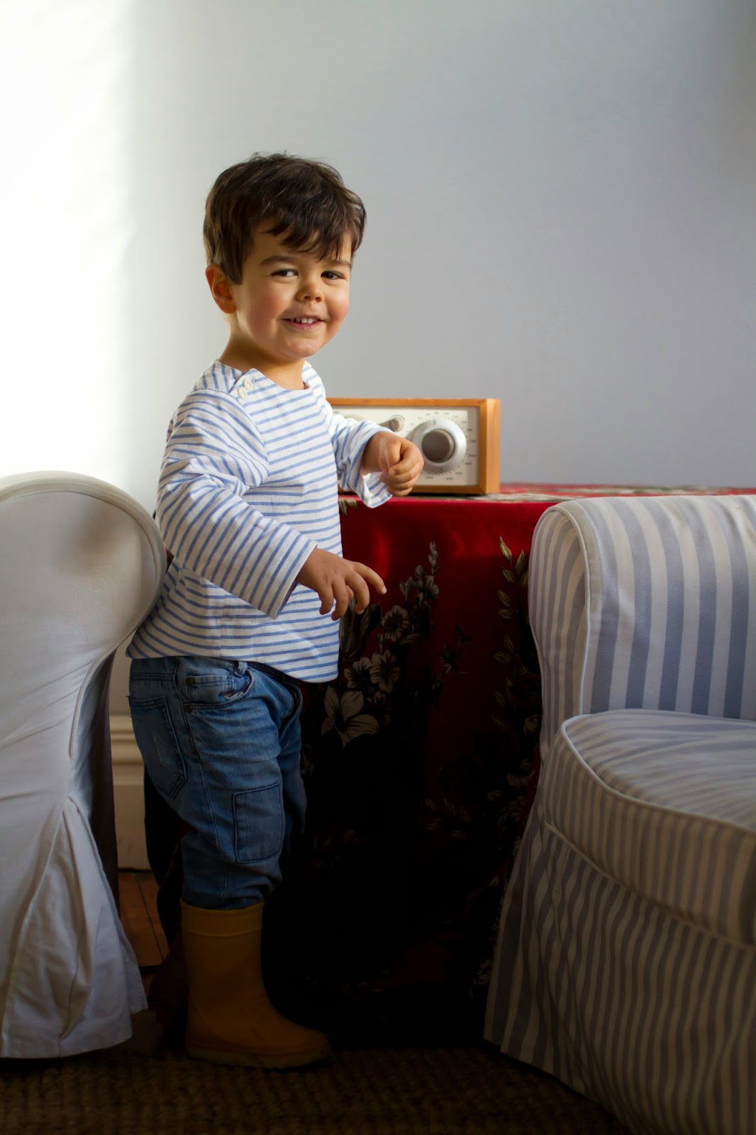 I can’t stop making clothes for Rodrigo — my latest piece is a classic marinière. These stripey shirts are timeless and suit absolutely everyone. I followed the Sailboat Top pattern by Oliver + S (I’d already used it to make pyjama tops, remember?) but this time I picked a cotton knit rather than a woven fabric. I cut a size 3 (Rodrigo is only 2) and the fit is great, despite being on the sort side… I’m coming to the conclusion that, just like me, this boy has a long torso (I’ll have to start lengthening the patterns I use for him). He makes for a rather cute Breton, doesn’t he?