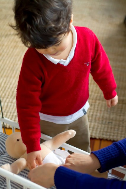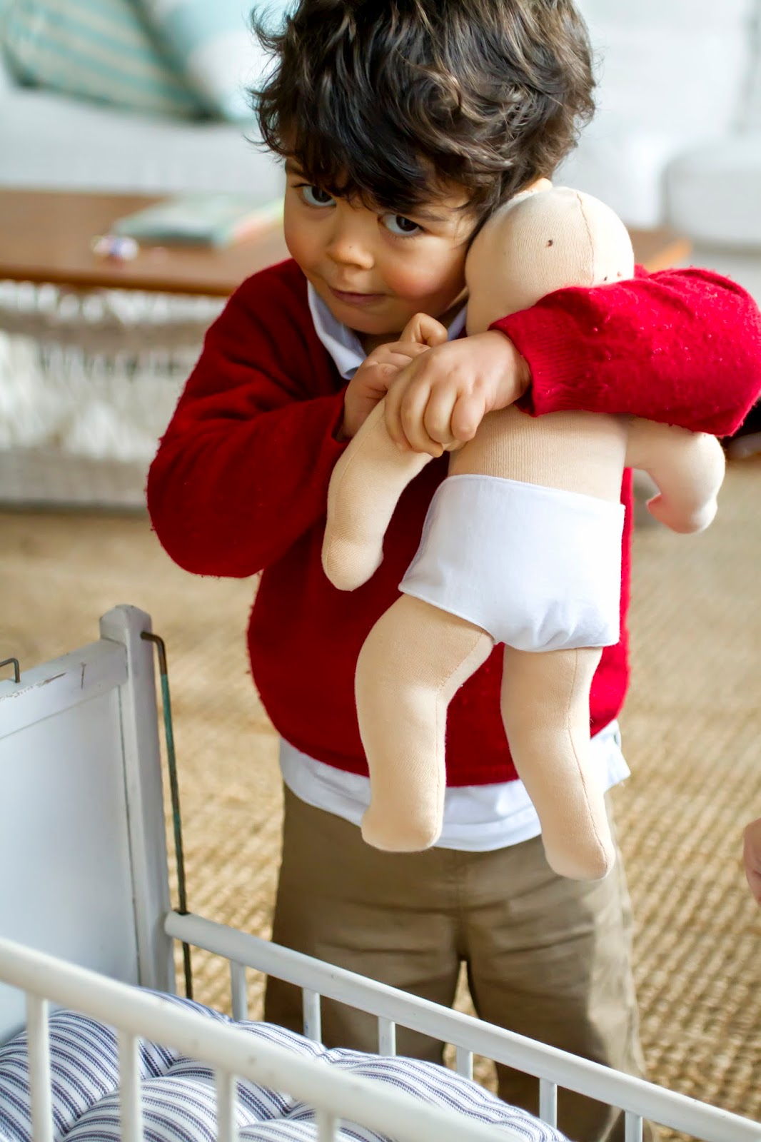 The doll is almost ready and Rodrigo adopted it even before I had managed to sew on the legs. It’s so funny to watch him treat it like a real baby: cuddling it, putting it to sleep and covering it with a quilt… but he also throws it around and tries to climb into the doll cot. I wonder what he’s going to do to his little brother!