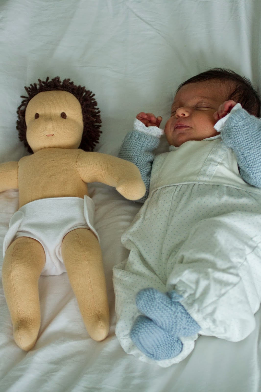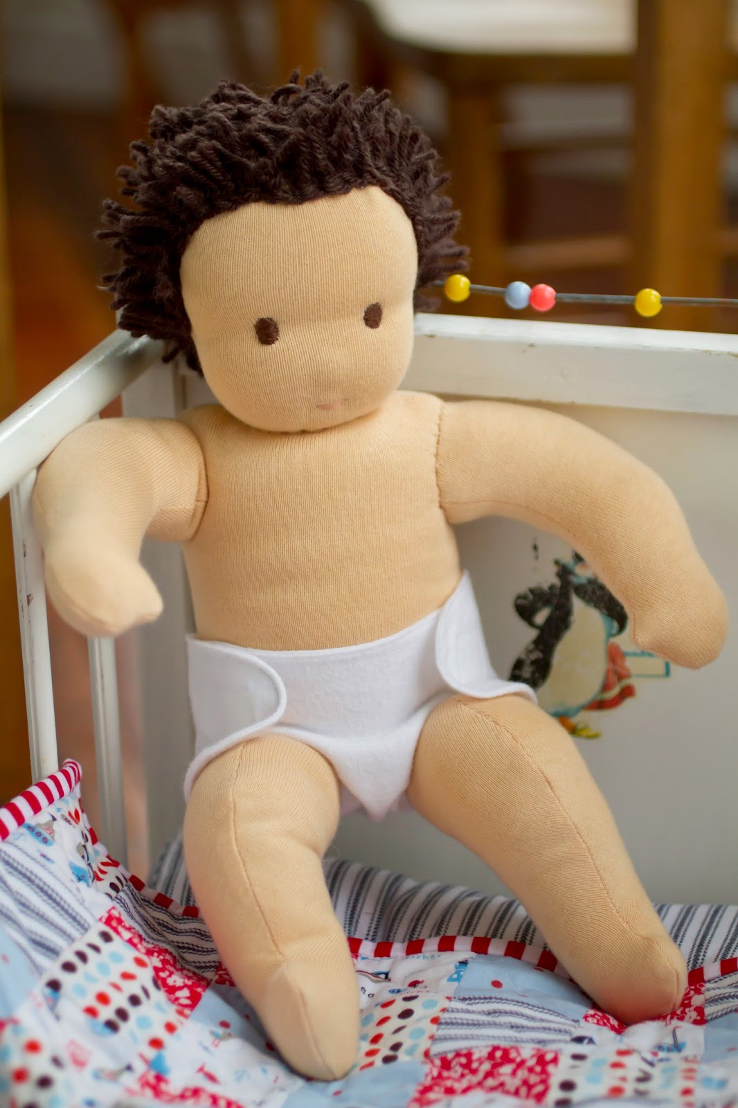 I finished the Waldorf doll a few days before Pedro was born. My mother crocheted the wig (thanks, mum!) and I added some comforts to his life: a mattress, a quilt, a bed, a bottle and even a pushchair (both the bed and the pushchair were bought second hand at a local market). I still haven’t sewn any clothes for him but I know I’ll do that eventually.