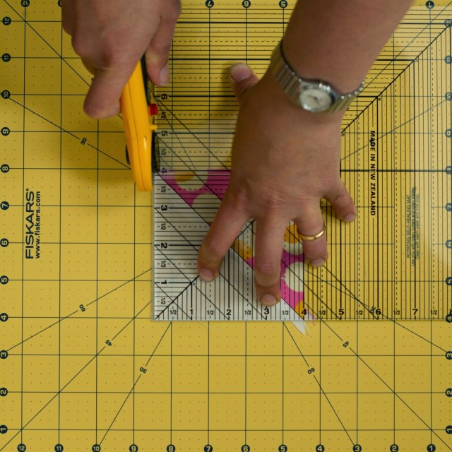 And then I read on several blogs that I should square up those triangles. And my mother confirmed it. It’s true that they end up a bit crooked after all that sewing and pressing (it has to do with the fact that the fabrics are sewed on the bias).