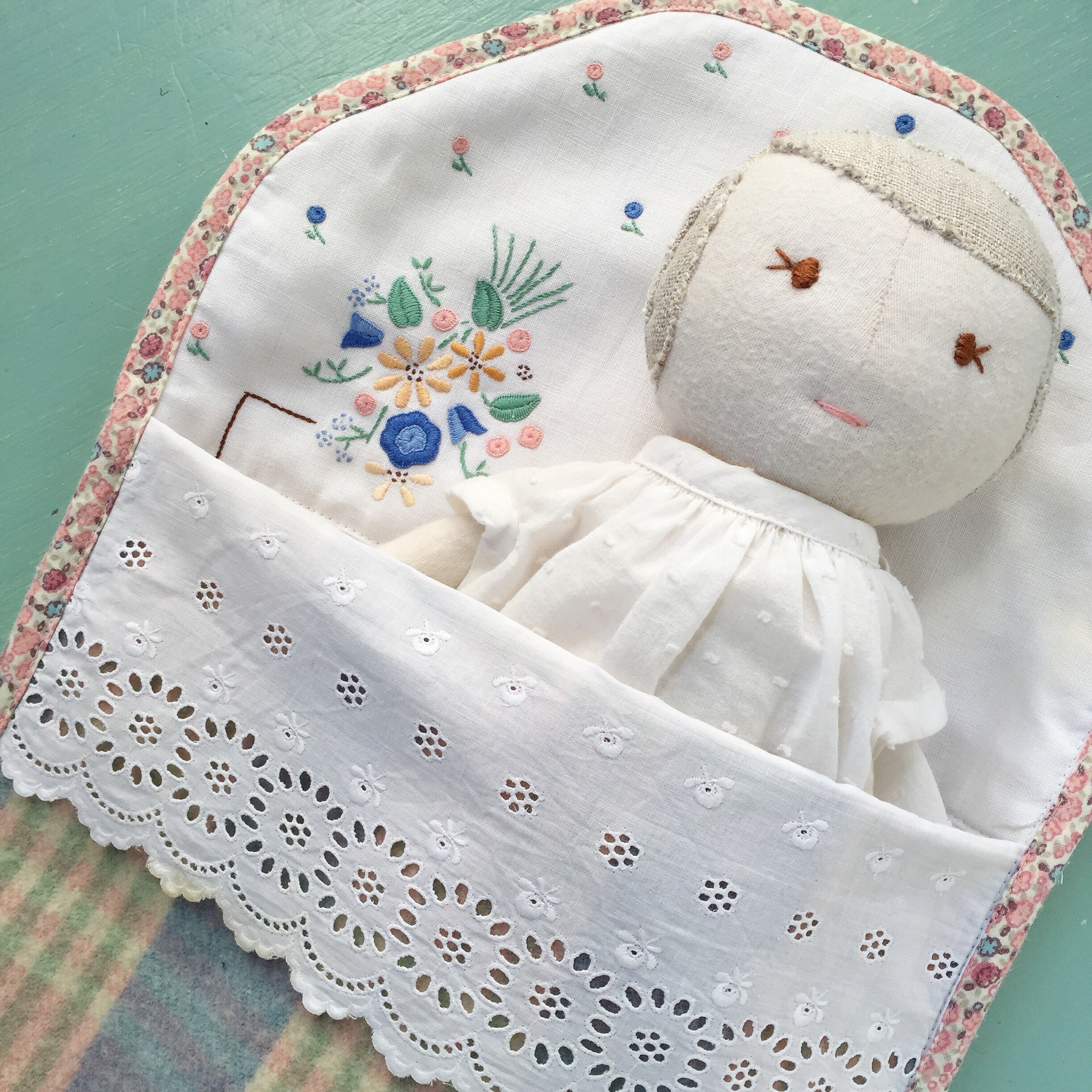 I also had the change to practise my favourite activity: giving new uses to old materials. This doll’s wardrobe was entirely made with second hand fabrics, most of them repurposed from old clothes. The dress and the white blouse were originally nightgowns I bought in charity shops. The felt boots used to be a wool jumper (more on homemade felt here). The cape was salvaged from a skirt. Her sleeping bag was made with a mid-century embroidered tray cloth, an old wool blanket, a piece of Portuguese chita that makes me think of ticking mattresses and a piece of border anglaise left over from my duvet covers (the inspiration for the sleeping bag came from Florence’s adorable bear sleeping bags).