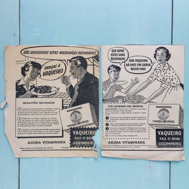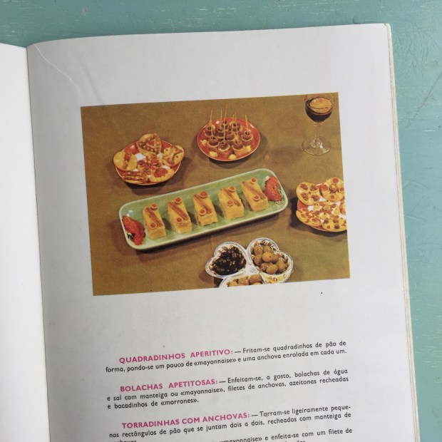 No fim-de-semana passado fui convidada para uma festa de anos retro. A aniversante adora tudo o que é vintage (é grande frequentadora de lojas de caridade e tem um olho incrível para descobrir aquilo que ninguém vê à partida). Cada convidado foi desafiado a trazer consigo uns quantos pratos de comida retro – o tema era anos 70-80. Eu achei a ideia bem gira e lembrei-me logo da minha colecção de livros e panfletos antigos de receitas — aqueles do fermento Royal, margarinas Chefe e Vaqueiro, conservas de peixe de Portugal… estão a ver o género. Os meus livros são sobretudo dos anos 50 e 60 (tenho dois dos anos 20 cujas ilustrações hei-de mostrar-vos um dia), mas isso não me deteve. Mais vinte anos, menos vinte anos…
