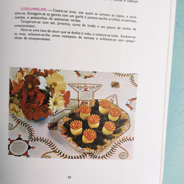 Mas hoje não resisti a deixar umas linhas: quando eu fiz 7 ou 8 anos, ofereceram-me O Meu Primeiro Livro de Cozinha, da Verbo. Guardo-o até hoje e é lá que vou buscar a receita de bolo mármore e de uma sobremesa gelada de morango que nunca me deixa ficar mal. Lembro-me de um Natal em que a minha mãe fez o tronco de chocolate, de uma manhã em que deixei a cozinha em estado de sítio a tentar fazer uns ovos recheados com atum e tomate…. foi por ali que o meu gosto pela cozinha começou… O livro é todo anos 70! As suas fotografias remeteram-me imediatamente para ele…