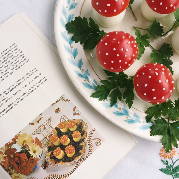 First I made these toadstool eggs. I think there are irresistibly kitsch and actually quite good for you. I confess I didn’t follow the instructions to the letter — I just added the tomato tops and, of course, I decorated the platter with lots of parsley.