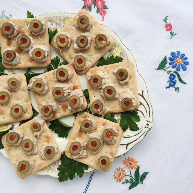 Finally, I garnished some cream crackers (a classic!) with tuna paste, edam cheese, stuffed olives, roasted peppers and anchovies. Again, I decorated the plates with parsley (thankfully parsley grows vigorously in our garden).