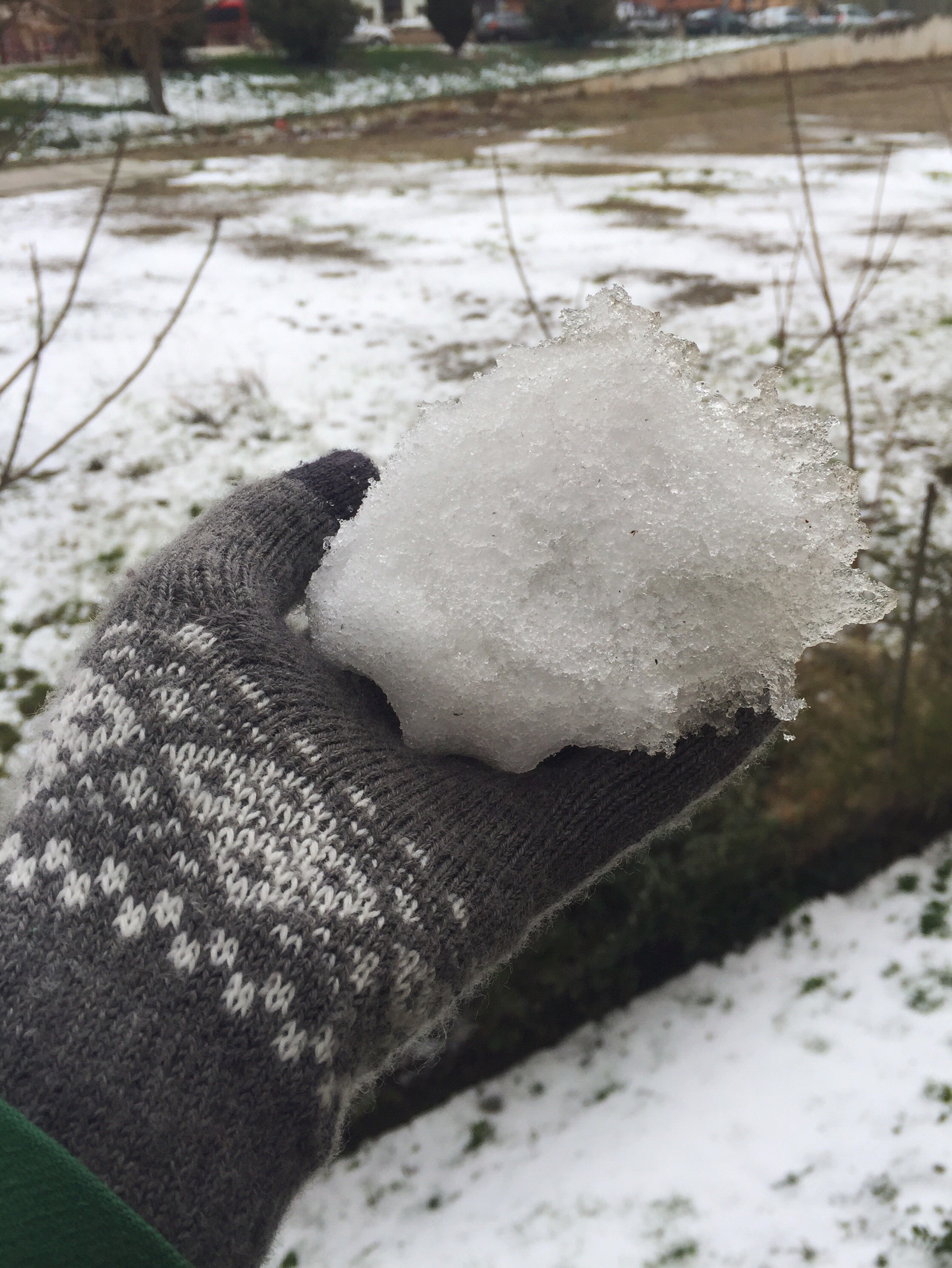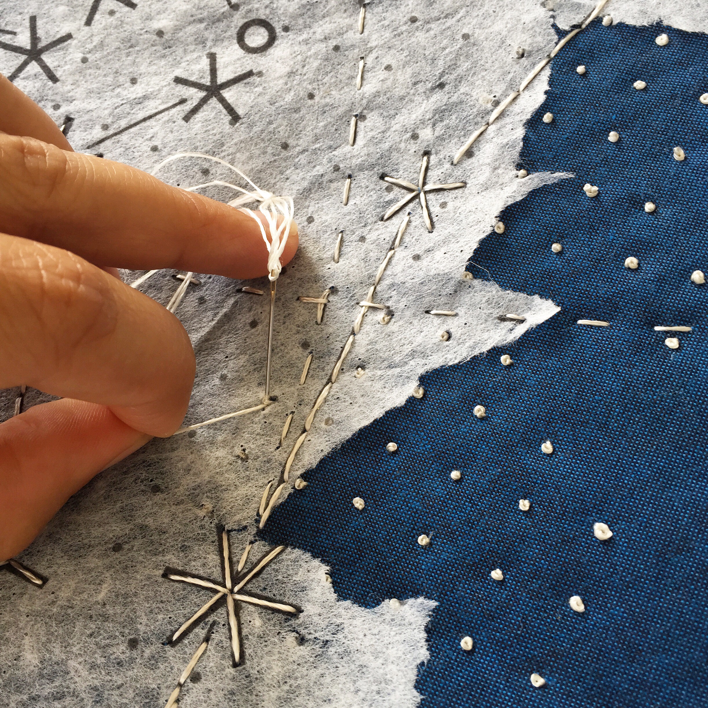 Once the four layers (backing, wadding, top and template) were all pinned and basted together, I got the largest embroidery hoop I could find at home (I actually had to steal it from that stuffed reindeer in the play room) and started embroidering. You make your stitches over the interfacing, which you then tear away gently at the end, and the stitches are very simple: it’s just back stitch and French knots. [You can have a look at the general instructions here.] The rayon thread I picked wasn’t the easiest (actually, I only realised it was rayon and not regular cotton once I got home from the shop… but it does have a nice cosmic sheen to it that’s perfect for embroidering stars) but it was still perfectly manageable.