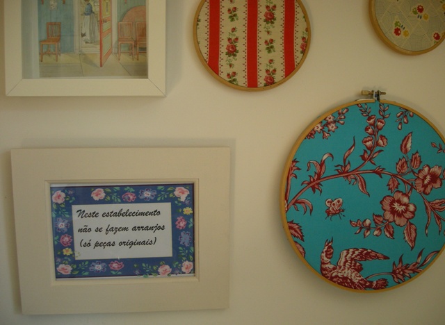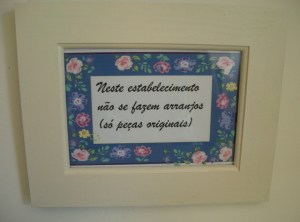 This was the first one I painted. I was given this by a person to whom I refused a couple of seamstress little jobs, like mending travel bags or hemming trousers. I used to joke and say “I don’t mend” when I just didn’t feel like doing the job. How can I translate this? It’s something like “In this shop we don’t mend (we only make original pieces)”. In traditional Portuguese cafés or grocer’s there are sometimes a little piece of metal with an inscription stating “we don’t sell on credit”… this pretends to be something similar to that. Anyway, I thought it was funny and hung it near my sewing machine.