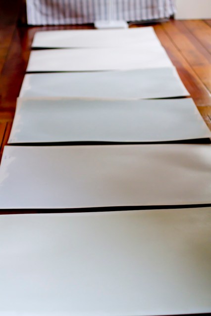 Forrei um dos armários com as páginas de um atlas desactualizado e o outro com pautas de música. Para colá-los à parede, usei blu tack (bostik), pela simples razão de que era aquilo que tinha à mão. Em seguida, o Tiago teve a gentileza de colocar as prateleiras (feitas de contraplacado e que eu — ou ele? já não me lembro… isto já foi feito há uns tempos — tinha previamente pintado de branco).