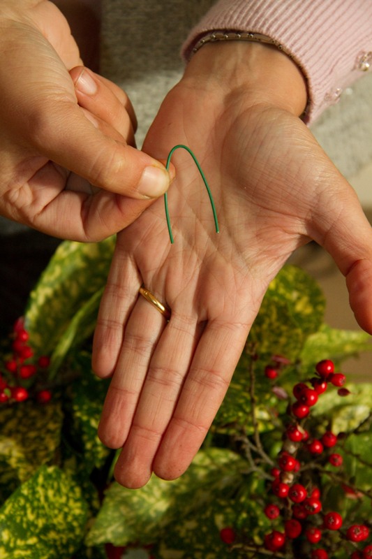 7. Coloque ramos de bagas encarnadas em três pontos equidistantes da coroa, usando bocados de arame em forma de U (v. passo 5).