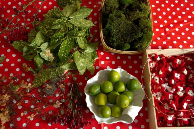 1. É importante ter uma superfície de trabalho com algum espaço e que se possa sujar sem problemas (eu cobri a mesa da casa-de-jantar com oleado). Depois há que dispor o material que se pensa usar na coroa, mesmo que se acabe por deixar muita coisa de fora. Se gostar de arranjos simples e naturais, o truque é manter a paleta de cores bastante restrita.