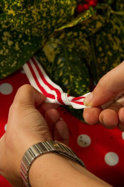 9. On the reverse side of the wreath, insert a piece of ribbon through the outer circle of the ring base and tie a knot at the end.