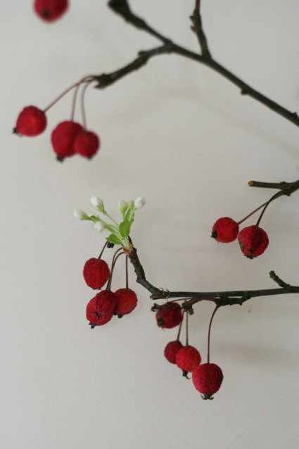 In Portugal Christmas decorations are traditionally taken down on Three Kings day. Homes get back to normal and life starts again. Today Nature gave me a sign of hope and renewal: as I was preparing to throw away the crab apple branches I noticed that the buds are bursting open! Of course now I’m going to keep them on the mantle – I just cut the bad apples and changed the water.