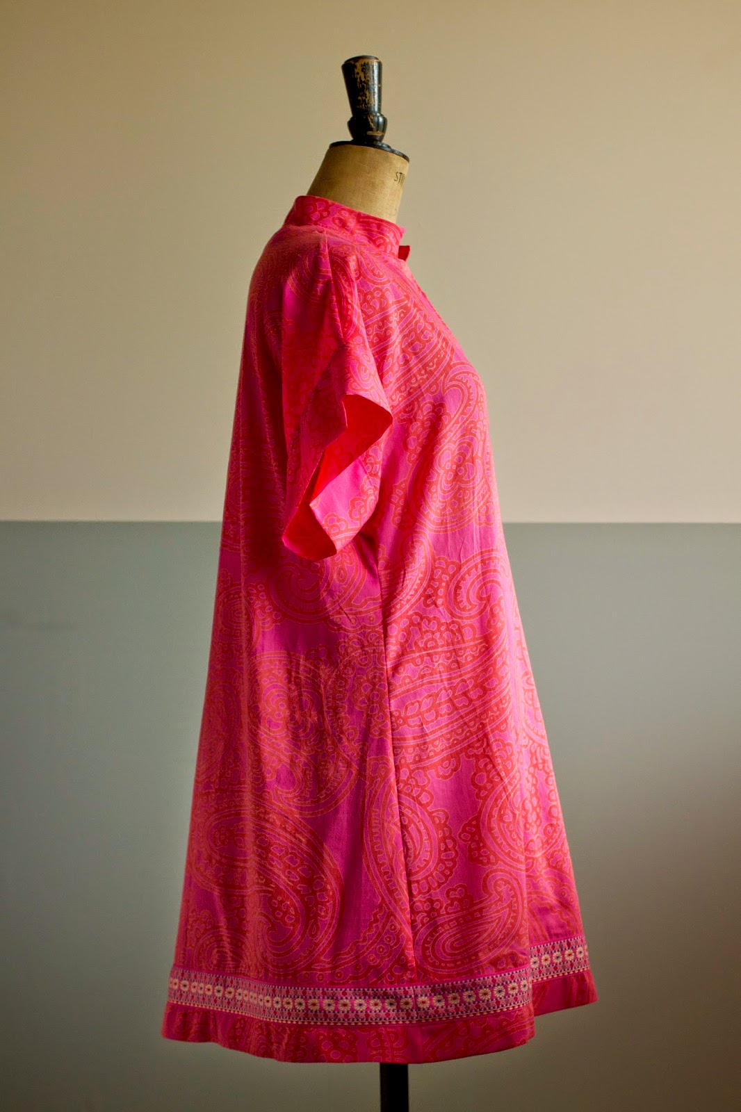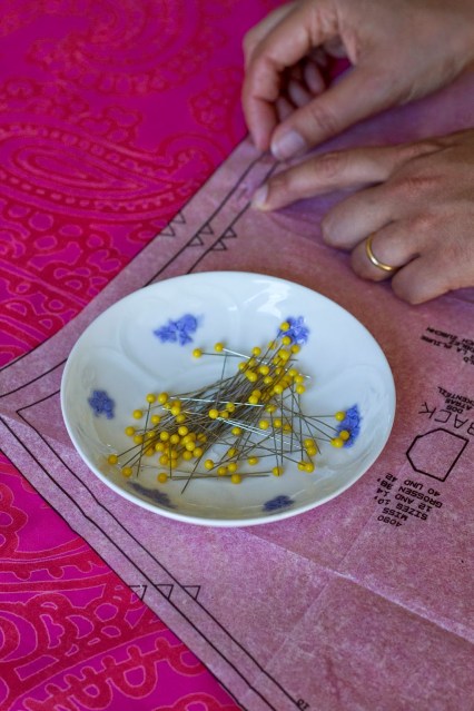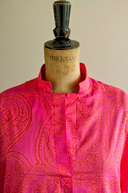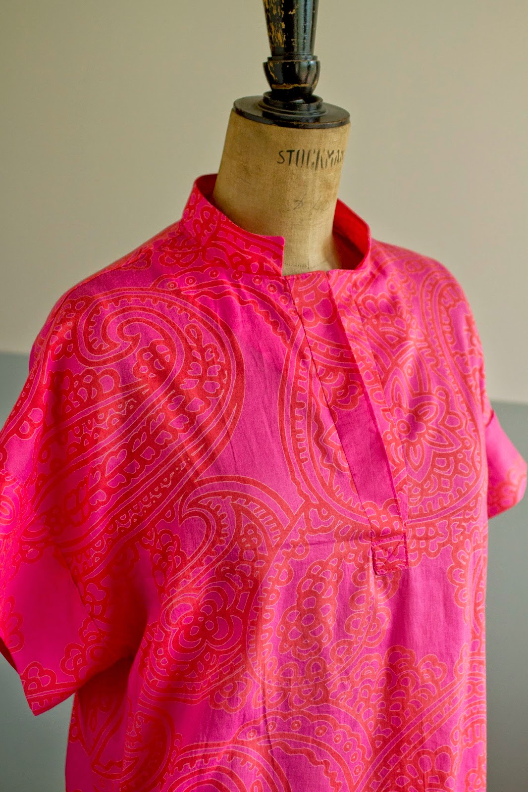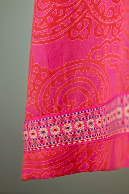In a city near my house in England, there was a fabric shop that was a real Ali Baba cave. In addition to the usual rolls of fabric, there were these baskets with remnants that were sold by weight (every remnant had some kind of flaw). This fabric came from one of those baskets. It features orange paisleys on a hot pink background and it’s a funny sort of material: very lightweight, quite hard to sew (I had to mess around with both the tension in my machine and the pressure of the foot) and it changes colour when it’s pressed (as soon as it cools down it goes back to normal). It looks like cotton to me because it doesn’t smell or feel like polyester, but I can’t be sure, and it’s not really appropriate for a dress because it’s sheer. But I really wanted to try out this pattern and I wasn’t feeling like making a toile out of, you know, muslin, so I went with it anyway. I think it’s perfectly acceptable as a beach cover-up.